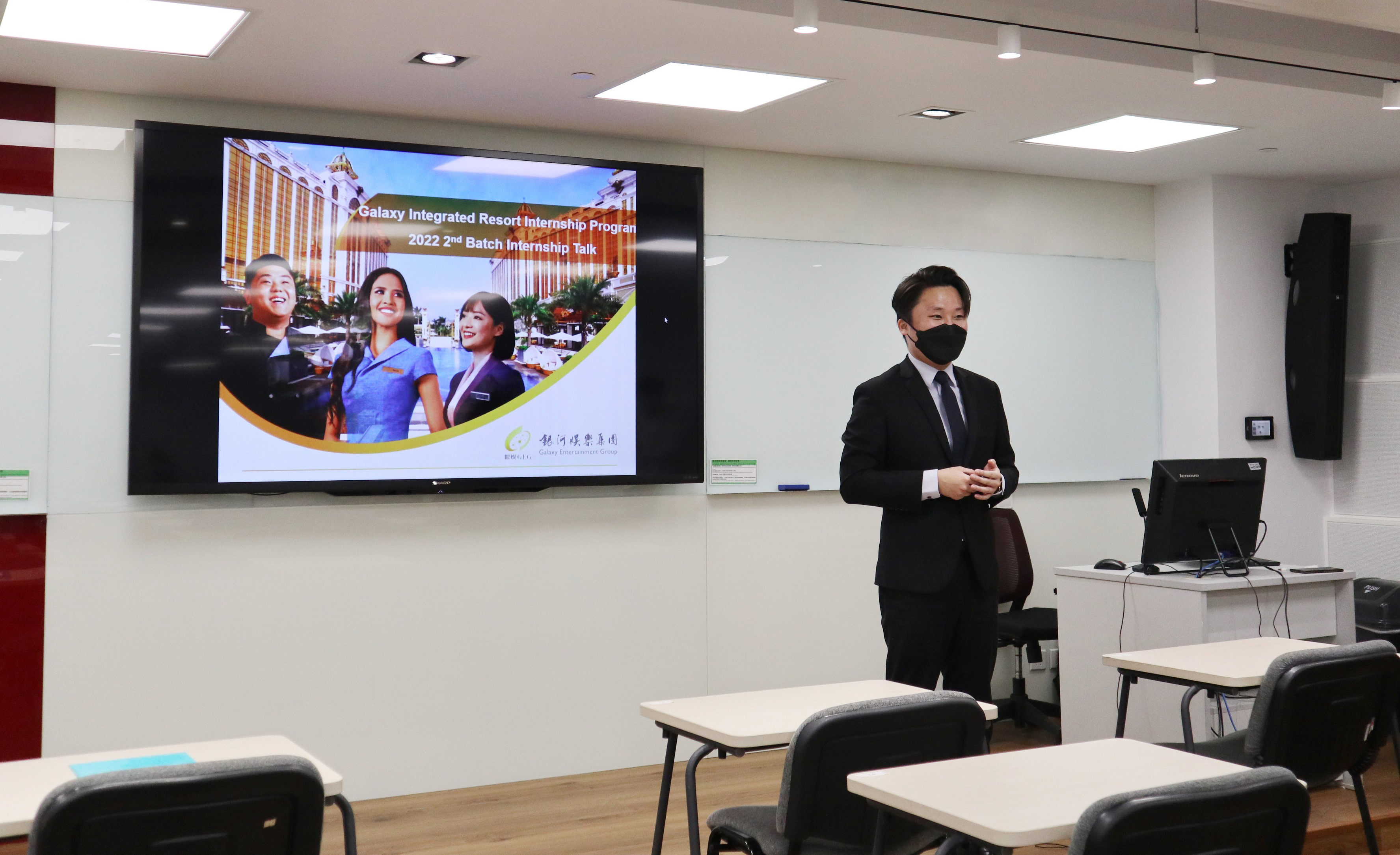 In order to develop interactions between students and the gaming industry and explore students’ career and internship opportunities, Macao Polytechnic University held an internship recruitment talk by gaming companies and invited Mr. Kennith Lei, Senior Officer of Talent Management & Leadership Development of the Human Resources & Administration Department of the Galaxy Entertainment Group to explain the Galaxy Integrated Resort internship program for the second half year of 2022 to the students of the Centre for Gaming and Tourism Studies. Students from the Bachelor of Business Admission in Gaming and Recreation Management program attended the talk and learned a lot.