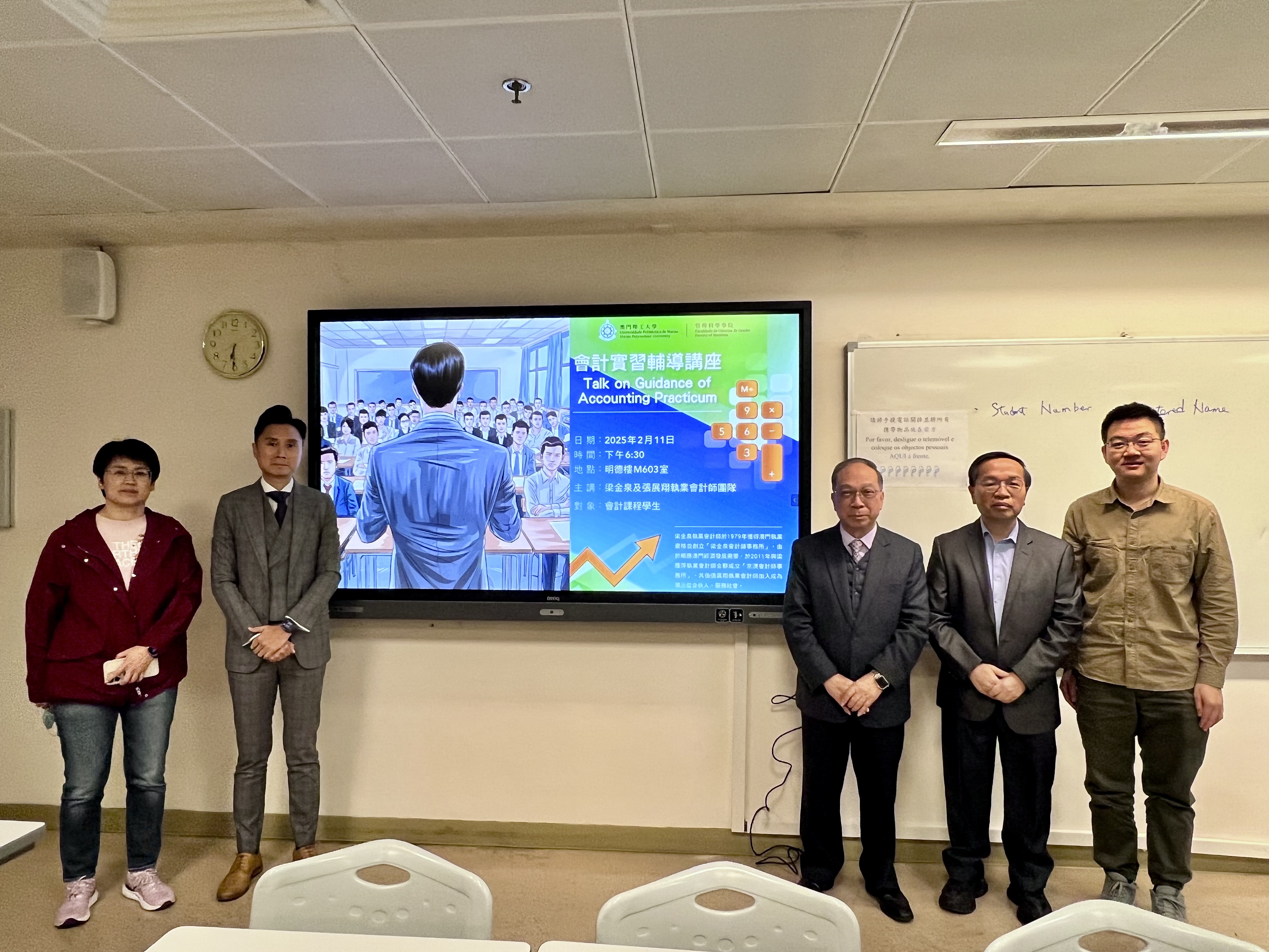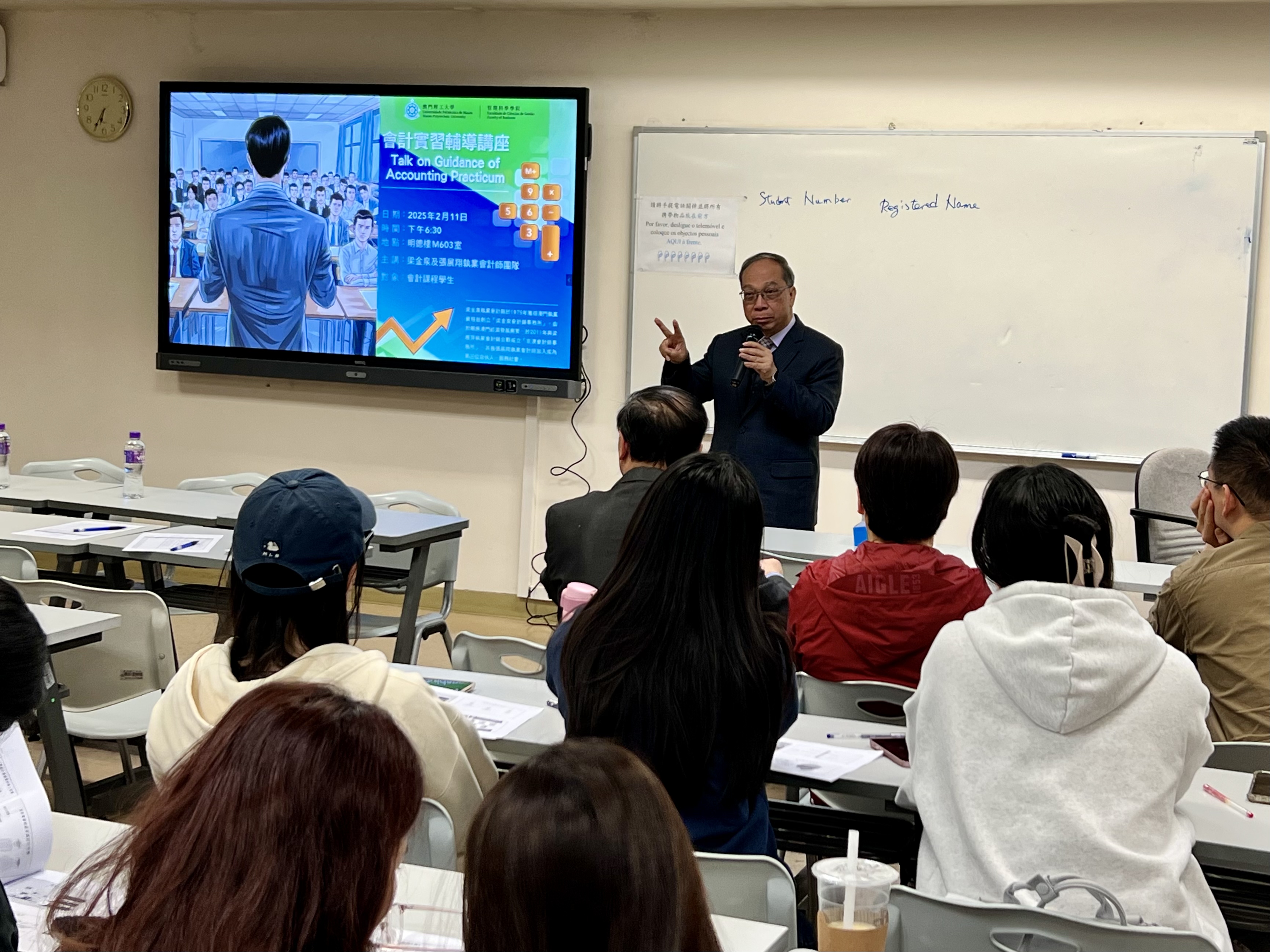 The professional talk was conducted on Feb.11, 2025 by Mr Leong Kam Chun CPA, and Mr Jason Cheung CPA (Partners of Keng Ou CPAs Firm), who introduced the background of Macao Accounting industry, the Accounting working environment and requirements, as well as skills and experiences of essence of Accounting, Auditing, and Taxation work at CPA firm, Accounting office work, practicum preparation, interview techniques and Accounting practicum work duties with the uses of AI.