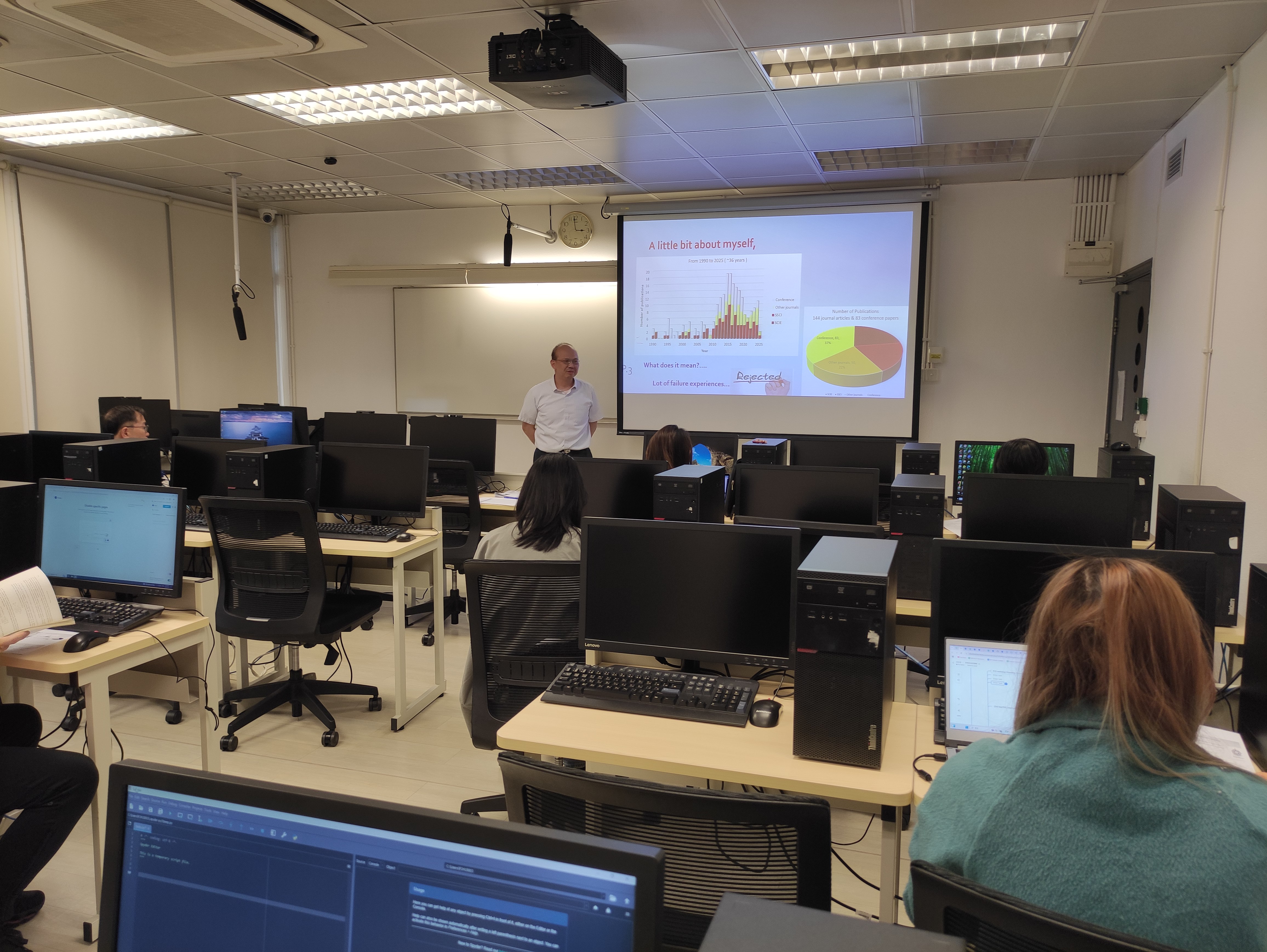 On March 19, 2025, four students and four faculty members, Dr. Yu, Dr. Gao, Dr. Fong and Dr. Lai, from the Faculty of Business at Macao Polytechnic University attended a workshop led by Prof. W.M. To. The session took place in computer room A211 from 2:30 PM to 4:30 PM.