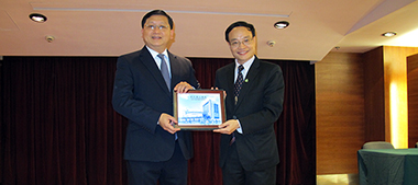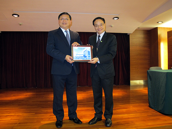 理工管理科學高等學校黃貴海校長(右)向葉燕民致送紀念品 |