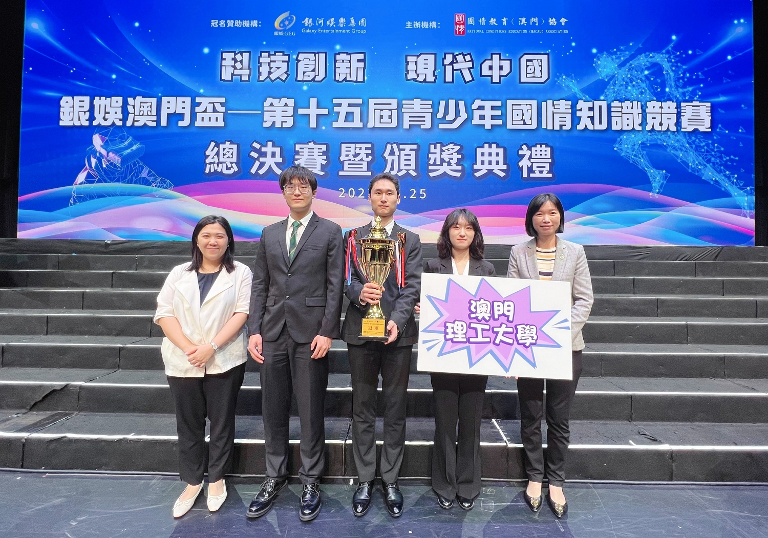 由國情教育(澳門)協會主辦的第十五屆青少年國情知識競賽總決賽於5月25日下午舉行,今年以“科技創新·現代中國”為主題,共吸引來自澳門二十九所高等院校及中學的一萬多名學生參與比賽,競逐殊榮。經過連番激烈的比拼後,澳門理工大學勇奪大學組冠軍,連續兩年勇奪該項比賽的冠軍。