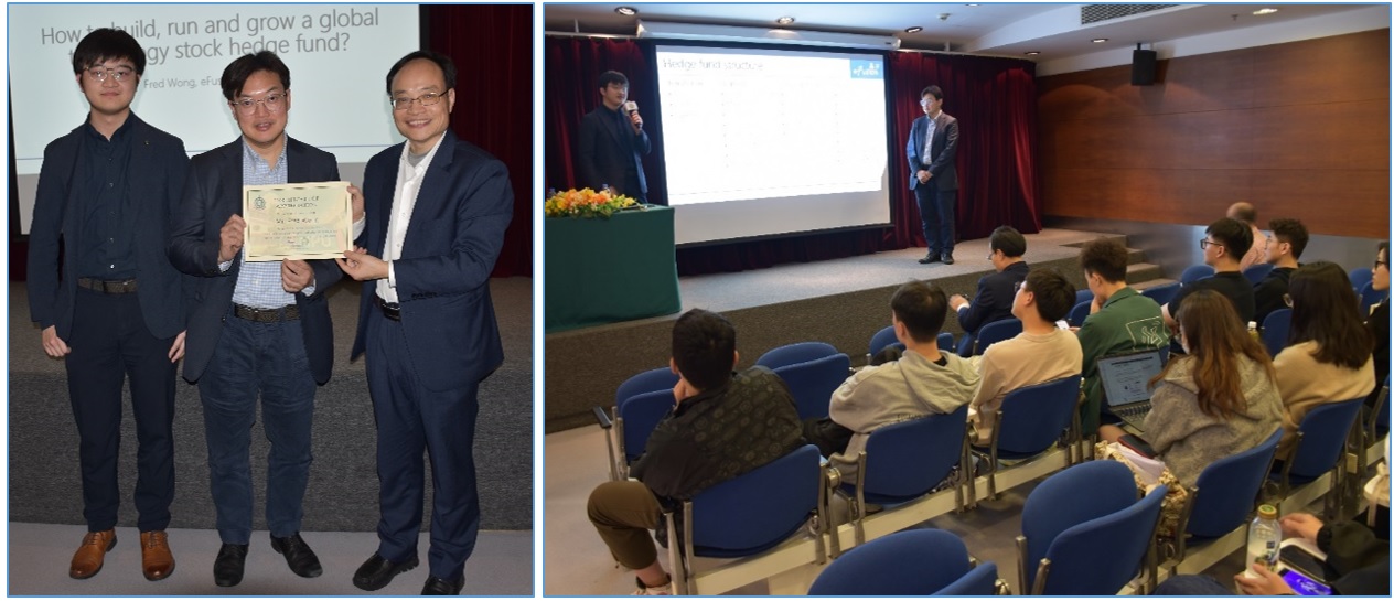 本院邀請到易方資本創辦人及投資總監王華先生及助理基金經理王逸研先生為師生舉辦了“如何建立、經營和發展全球科技股對沖基金” 講座。約80名金融與數據分析理學碩士學位課程學生及其他課程的同学出席了講座。王華先生及王逸研先生在講座上介紹了對沖基金的運作、如何裝備自已以進入對沖基金行業、如何在交易時取得優勢,以及行內一些趣聞等等。他又以近期熱門的Nvidia公司為例子,教導學生如何分析該公司的產品、相關利益團體以及對其進行財務數據上的分析,從而能夠在市場上早着先鞭,捕捉到該公司股票的漲勢。他們除了介紹對沖基金內部不同職位的詳細功能外,也介紹了不同基金的類型及策略,比如有的基金只做多頭,有的同時會有多頭及空頭的倉位(long/short),有的甚至只做沽空策略,也有的做事件驅動策略,宏觀策略,量化策略等等,令師生增加了對衝基金行業的認識。本院持續邀請各領域的專業人士為同學舉辦講座,以拓寬同學對各領域管理的認知。
