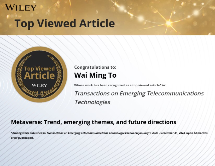 本院的杜偉明教授和余達緯副教授與兩位來自香港的專家合作撰寫了題為“元宇宙;趨勢、新興主題和未來方向”的文章,發表在《新興電信技術學報》上。這篇文章引起了全球研究人員和持份者的廣泛關注,並被認為該期刊上瀏覽量最高的文章之一。