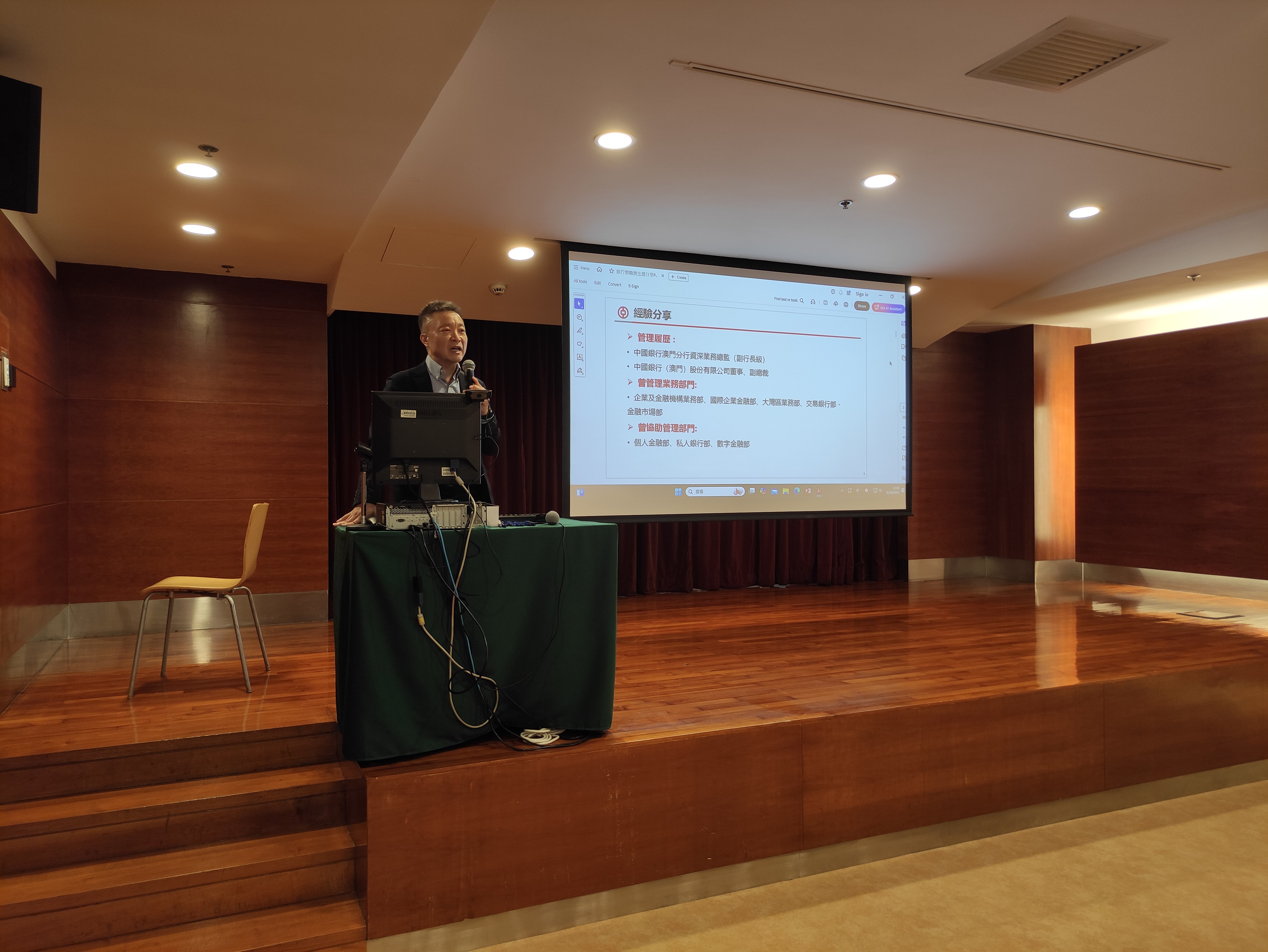 中國銀行澳門分行資深業務總監、董事、副總裁楊志光先生在2025年10月8日為本院學生主講“職業生涯發展分享”講座。他為同學們分享了大學生畢業後的行業選擇和職業生涯規劃、銀行業對社會發展的貢獻和價值、銀行從業員的職業優勢、澳門中銀的發展概況和主營業務等內容,又為同學們在面試、入職後的職業發展路徑、自我提升方法和社會活動參與等方面提供了十分有價值的指導,使同學們對職業生涯發展有了更深的認識。