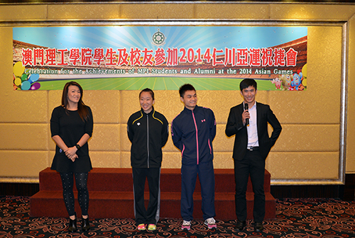 To commend and celebrate students and alumni for their outstanding performance at the 17th Incheon Asian Games 2014,the Student Affairs Office of Macao Polytechnic Institute (MPI) organized a celebration gathering. The students and alumni of MPI participated in the Incheon Asian Games in sports including Wushu, Karate, Judo, Swimming, Triathlon, Athletics, Diving, and Road Cycling. Amongst others Jia Rui, an MPI alumnus, brought home a silver medal in the men’s Changquan final, Paula Cristina Pereira Carion, an MPI alumna, won a bronze medal in Women's Kumite +68 kg, Li Yi and Huang Junhua, students of MPI, respectively won the silver medals in the women’s Jianshu/Qiangshu all-round and the men’s Nanquan/Nangun all-round (martial arts events).