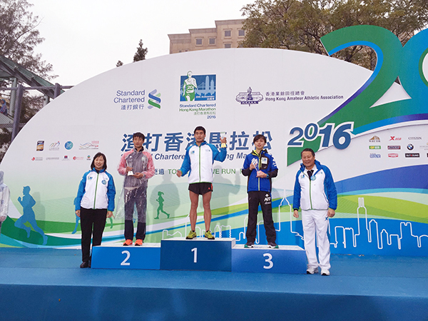 Alumnus Wang Kun (2nd from left) was 1st runner up in the Standard Chartered Hong Kong Marathon 2016 Half Marathon Challenge Men’s Overall and Men’s Senior Category.