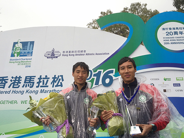 Alumni Wang Kun (left) and Iao Kuan Un (right) at the Standard Chartered Hong Kong Marathon 2016.