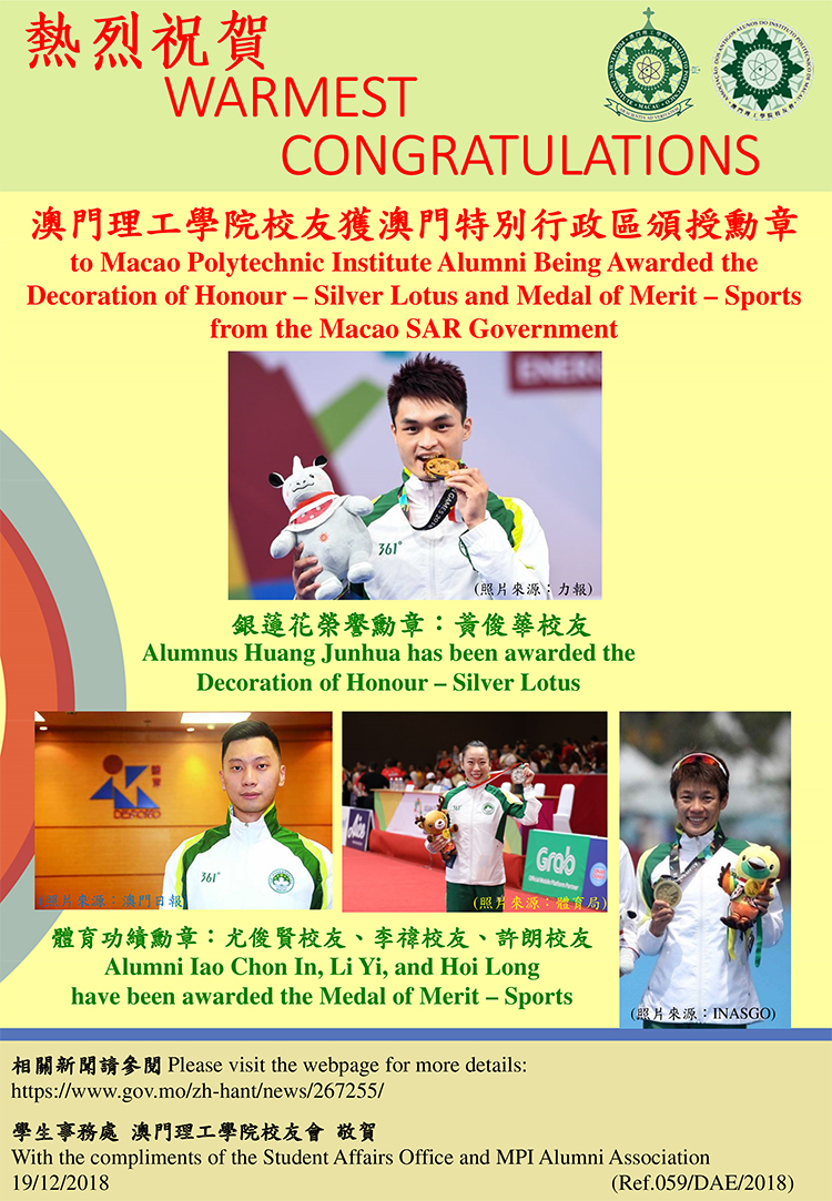 Congratulations to MPI Alumni Being Awarded the Decoration of Honour – Silver Lotus and Medal of Merit – Sports from the Macao SAR Government