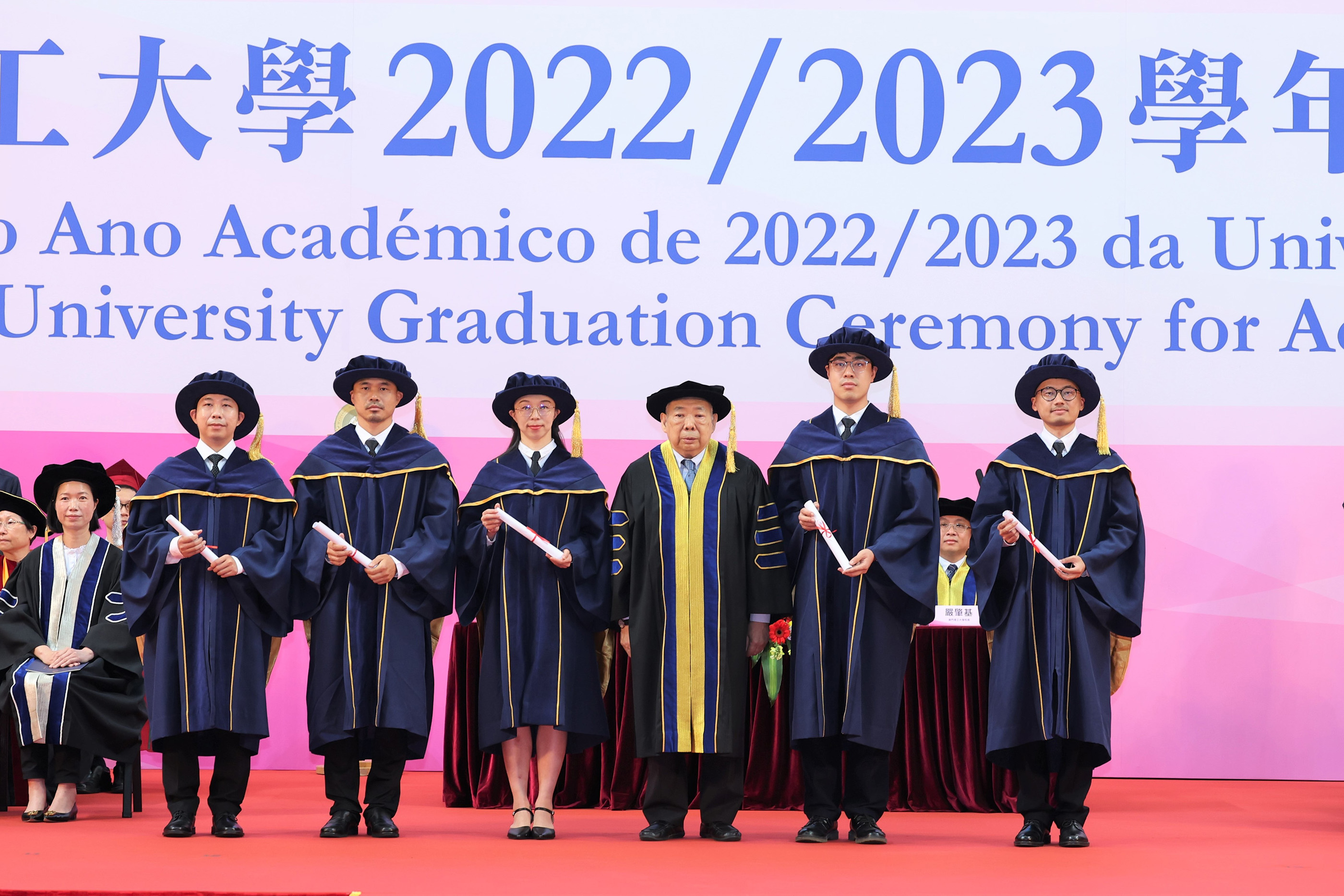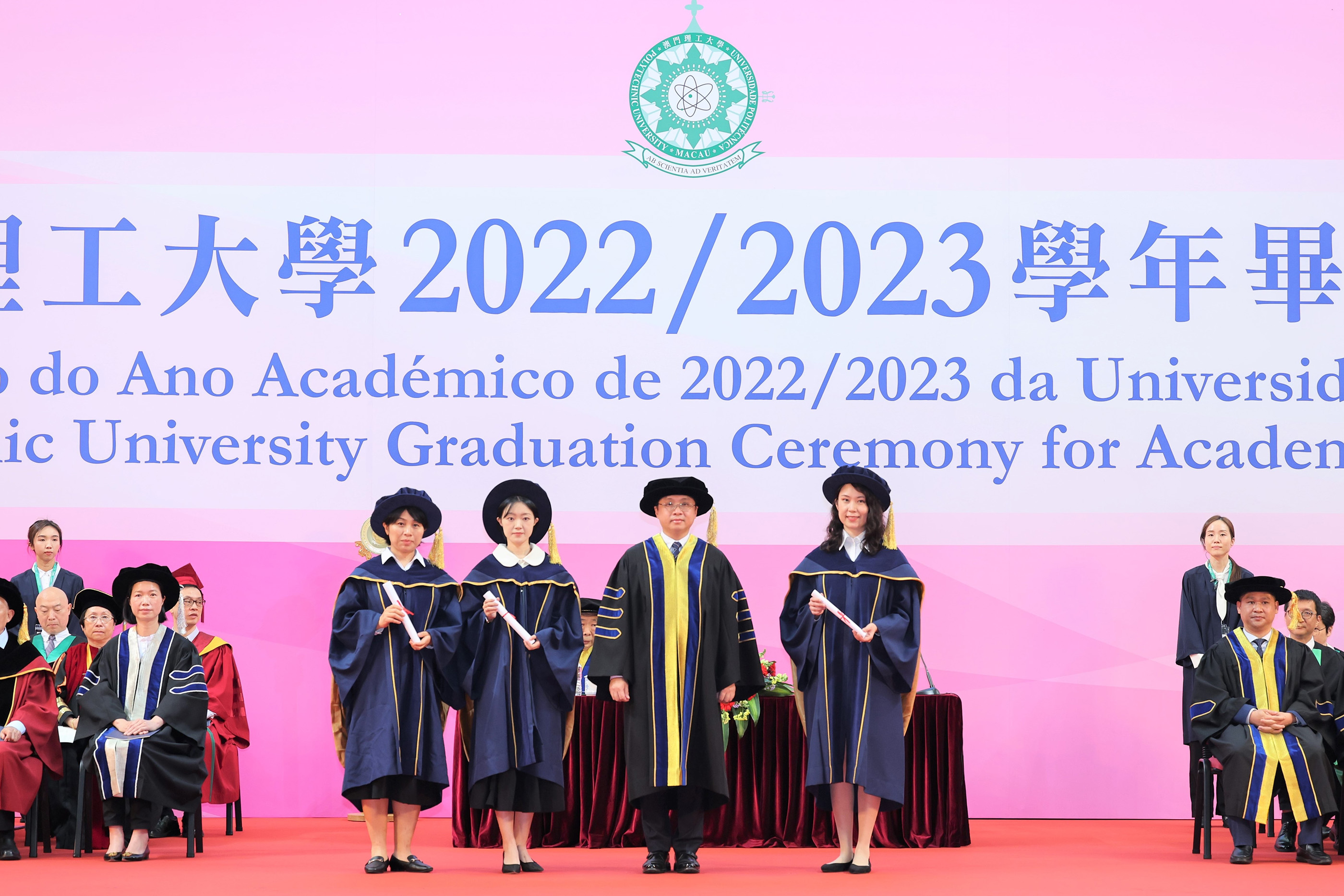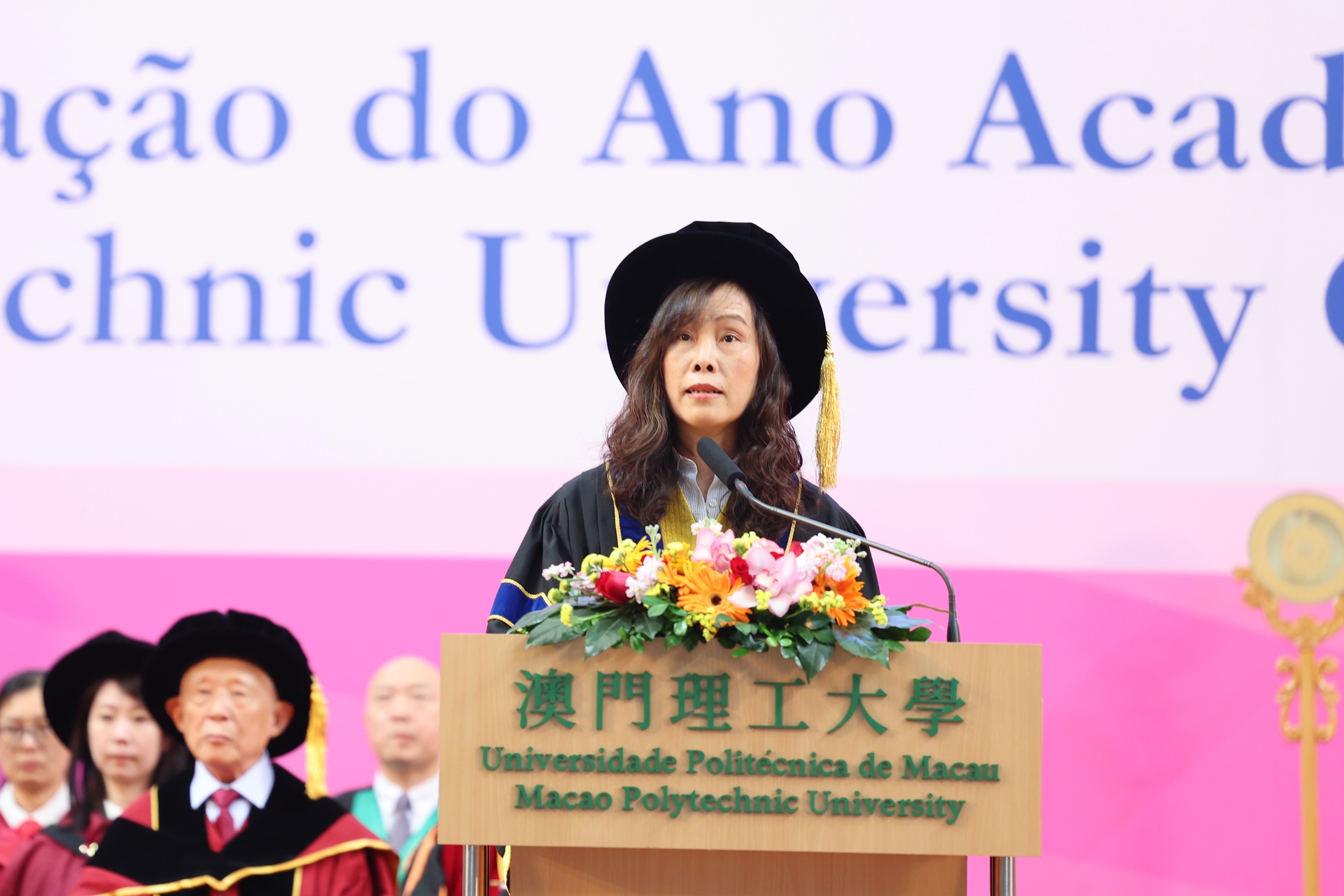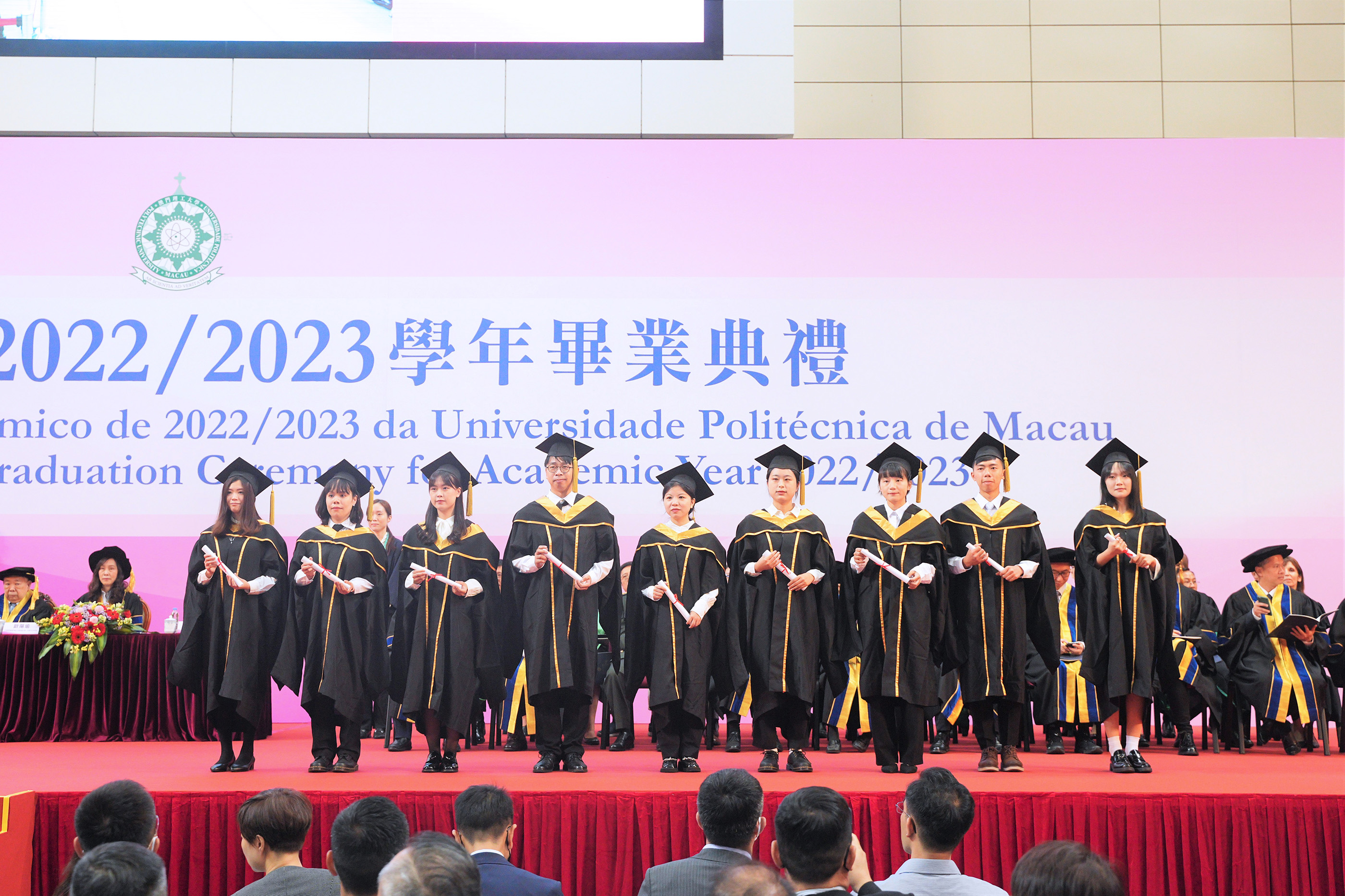 The graduation ceremony was officiated by Ms. Ao Ieong U, the Secretary for Social Affairs and Culture, Mr. Shi Shuzheng, Deputy Director of the Education and Youth Affairs Department of the Liaison Office of the Central People's Government in Macao, Mr. Gao Yuan, Director of the Department of Information and Public Diplomacy of the Office of the Commissioner of the Ministry of Foreign Affairs in Macao, Mr. Dai Jinsong, Deputy Commander of the People's Liberation Army Macao Garrison, Dr. Chui Sai Cheong, President of the Macao Polytechnic University Council, Prof. Im Sio Kei, Rector of the Macao Polytechnic University, and Mr. Wong Kin Mou, Acting Deputy Director of the Education and Youth Affairs Bureau. Over 3,000 people attended the ceremony, including representatives from secondary schools, scholarship donation organisations, various sectors of society, graduates, and their families and friends.