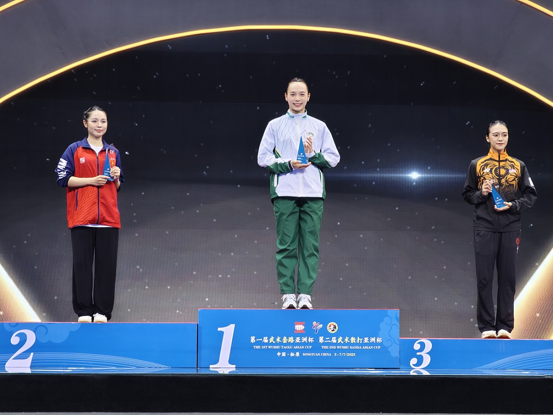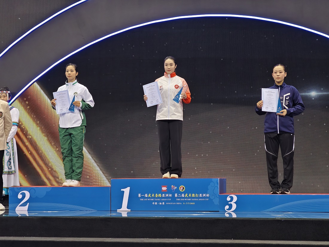 The 1st Wushu Taolu Asian Cup and the 2nd Wushu Sanda Asian Cup were held in Songyuan City, Jilin Province. These prestigious competitions brought together hundreds of athletes from 20 countries and regions across Asia to contend for multiple honours, marking the events as key milestones in the region’s martial arts calendar. Students and graduates of the Macao Polytechnic University (MPU) delivered outstanding performances, shining brilliantly on the international stage. Their achievements included one gold, three silver, and one bronze medal, earned across various categories: Women’s Jianshu, Men’s and Women’s Changquan, Men’s Jianshu, and Women’s Sanda (60 kg category) — bringing pride and glory to both Macao and the university.