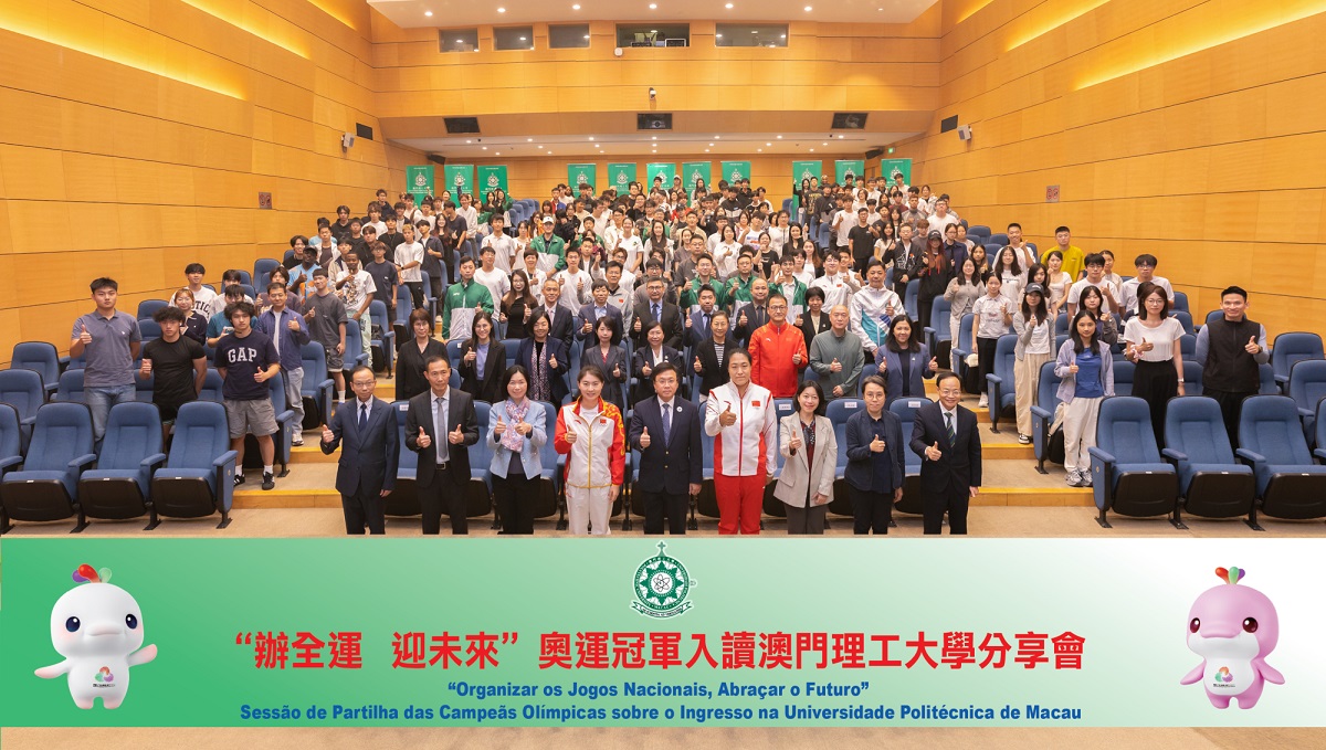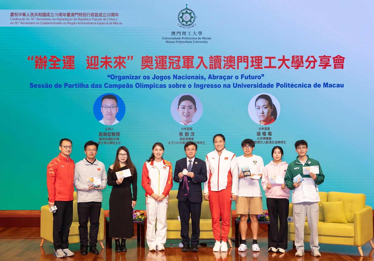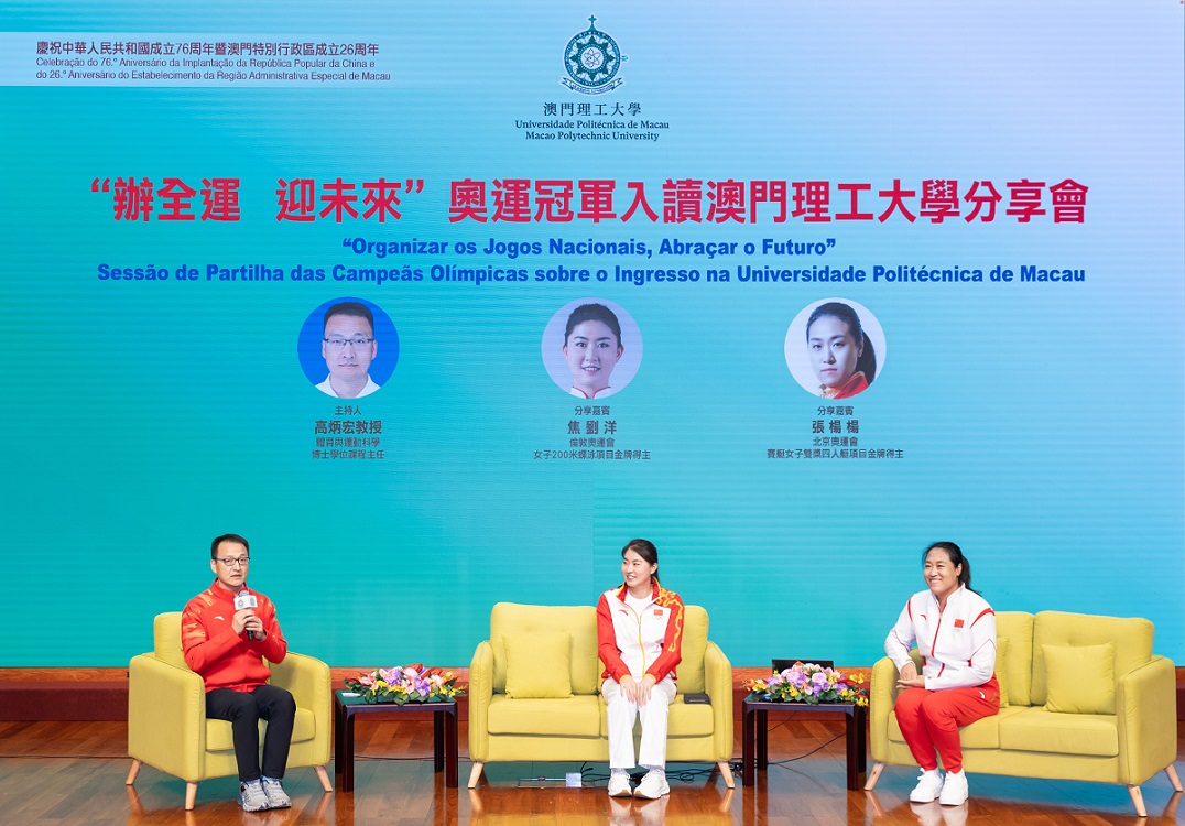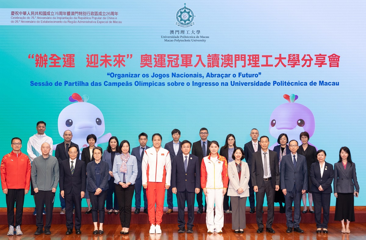 To celebrate the 76th anniversary of the founding of the People’s Republic of China and the 26th anniversary of the establishment of the Macao Special Administrative Region, Macao Polytechnic University (MPU) held the “National Games & Future” sharing session featuring Olympic gold medallists who are now MPU students. The event was led by current MPU students as well as Olympic gold medallists Jiao Liuyang and Zhang Yangyang. As the 15th National Games was around the corner, the two encouraged the youth to embrace a new era with vigour, propelling the growth of the sports sector in the Greater Bay Area. The event attracted an audience of over 300. Distinguished guests attending the session included members of the Administrative Board, deans, vice deans and department heads.