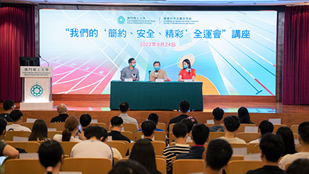 ![]() Palestra “Os Nossos Jogos Nacionais Simples, Seguros e Maravilhosos” organizada pela UPMA antecipar a realização da 15.ª edição dos Jogos Nacionais 2025, a ser realizada em Guangdong, Hong Kong e Macau, a Faculdade de Ciências de Saúde e Desporto da Universidade Politécnica de Macau (FCSD-UPM) organizou, no dia 24 de Setembro, uma palestra intitulada “Os Nossos Jogos Nacionais Simples, Seguros e Maravilhosos”, tendo sido convidados para proferir a palestra Tan Jianxiang, professor catedrático da Faculdade de Educação Física e Ciência do Desporto da Universidade Normal do Sul da China; e Au Chi Kun e Yu Xiaohan, respectivamente, professor adjunto e assistente estagiária da UPM, aproveitando as experiências de especialista, treinador e atleta para no conjunto incentivar os alunos universitários e outros jovens a participar activamente nos grandes eventos desportivos e nos Jogos Nacionais. |