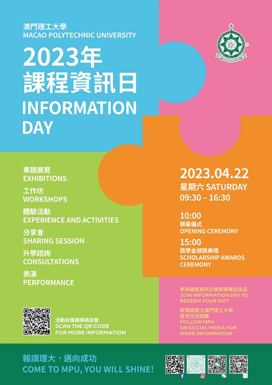 ![]() Realiza-se no próximo dia 8 de Janeiro o “Dia Aberto do IPM” – “todos os interessados são bem-vindos!”No próximo dia 8 de Janeiro (Sábado), o Instituto Politécnico de Macau (IPM) irá realizar o seu “Dia Aberto 2022 e Cerimónia de Atribuição de Bolsas de Estudo”, no qual haverá secções de especificação de cursos, consultas sobre o prosseguimento do estudo, exposições temáticas, visitas guiadas ao campus do IPM, workshops, espectáculos e actividades experimentais, tendo como objectivo permitir à sociedade conhecer de forma aprofundada os planos de estudo dos cursos do IPM e os resultados mais recentes alcançados no ensino e na investigação, podendo assim os interessados ter uma experiência sobre a vida escolar maravilhosa e sobre o ambiente escolar multicultural do IPM, permitindo ainda aos alunos excelentes galardoados com os prémios de estudo atribuídos pelo IPM compartilharem com o público a sua alegria e satisfação. Os alunos finalistas do ensino secundário e os seus encarregados de educação, a elite social e “todos os interessados são bem-vindos!” |