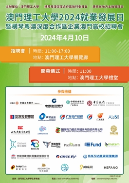 ![]() UPM realiza Feira de Recrutamento nas Instituições de Ensino Superior para as Empresas na Zona de Cooperação Aprofundada entre Guangdong e Macau em HengqinEm articulação com o desenvolvimento da diversificação adequada da economia de Macau “1+4” e a construção do “Projecto Geral de Construção da Zona de Cooperação Aprofundada entre Guangdong e Macau em Hengqin”, a Universidade Politécnica de Macau (UPM), a Comissão Executiva da Zona de Cooperação Aprofundada entre Guangdong e Macau em Hengqin e a Autoridade de Supervisão Financeira da Província de Guangdong co-organizarão o “Dia das Carreiras 2024 da Universidade Politécnica de Macau e Feira de Recrutamento nas Instituições de Ensino Superior para as Empresas na Zona de Cooperação Aprofundada entre Guangdong e Macau em Hengqin”. A feira de recrutamento terá lugar na UPM no dia 10 de Abril de 2024 (Quarta-feira), com a participação de 28 empresas de renome da Zona de Cooperação Aprofundada que disponibilizarão vagas de recrutamento e estágio nas áreas de ciência e tecnologia, finanças, medicina, cultura e turismo, entre outras, sendo bem-vinda a participação de todos os estudantes do ensino superior e jovens de Macau. |