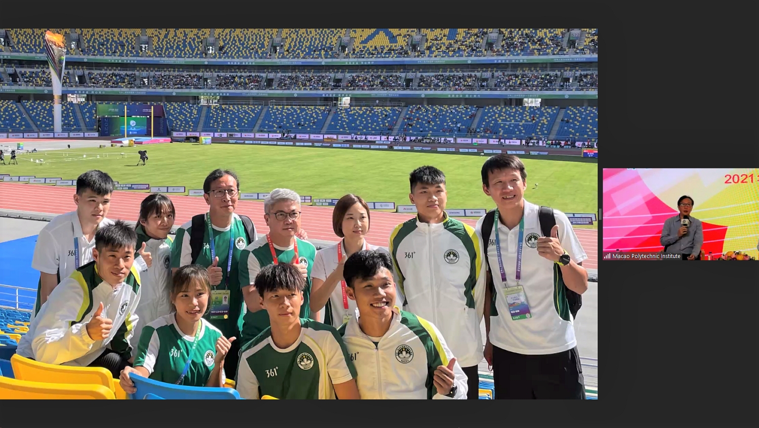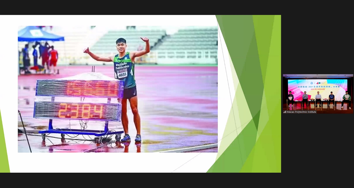 No âmbito das “Actividades para a Comemoração do 40.º Aniversário do Instituto Politécnico de Macau”, a Escola Superior de Ciências de Saúde e Desporto (ESCSD-IPM) organizou, no dia 22 de Outubro de 2021, em formato online, a sessão de partilha "Construir Sonhos e Empenhar-se nas suas Realizações - Bom Desempenho de Atletas de Macau nos Jogos Nacionais da China 2021", contando com a participação de vários alunos, professores e entusiastas do desporto, numa sessão de partilha que contou com várias interacções activas. Durante esta sessão, foram apresentadas algumas das preparações desportivas dos atletas de Macau para as provas de alta competição, incluindo a preparação psicológica e de adaptação ambiental, os detalhes sobre as competições e as respectivas resoluções, bem como algumas das experiências dos atletas de Macau relacionadas com a sua participação na 14.ª edição dos Jogos Nacionais da China.