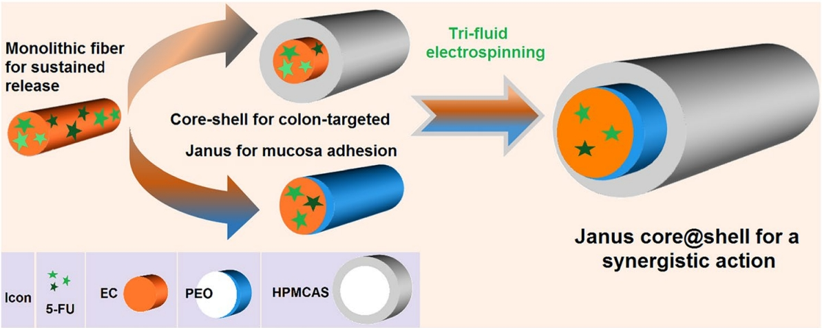 Nos últimos anos, os estudos relativos à aplicação de nanomateriais na área de biomedicina têm ganho cada vez mais atenção. Os nanohíbridos poliméricos estruturais são actualmente um tópico popular para os estudos sobre nanomateriais e podem ser concebidos para numerosas aplicações funcionais, incluindo pH-sensitive oral colon-targeted drug-delivery system. Nos estudos da equipa composta por investigadores da UPM e da Universidade Politécnica de Xangai, um novo material nanoestruturado Janus core@shell (JCS) foi fabricado usando uma eletrofiação trifluida, na qual três polímeros e o antineoplásico 5-fluorouracil (5-FU) foram posicionados, intencional e elaboradamente. O referido nanohíbrido tem uma forma linear fina com uma estrutura de múltiplas câmaras e uma espessura de casca de cerca de 24 nm, podendo aderir firmemente às membranas intestinais, reforçando o alcance de medicamentos ao intestino grosso e promovendo significativamente a absorção dos mesmos. O novo nanohíbrido desenvolvido pelos referidos estudos pode servir como uma poderosa plataforma de suporte para, além de ser um novo método para os estudos sobre o colon-targeted drug-delivery system, criar também um novo caminho para o desenvolvimento de diversos novos nanomateriais multifuncionais.