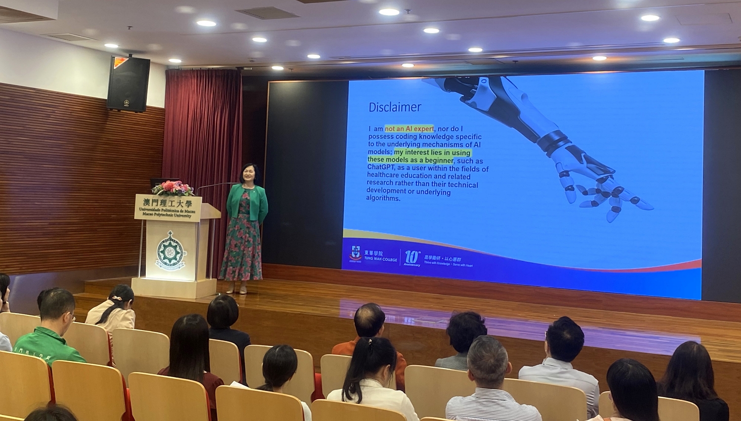 Para os profissionais de saúde e os estudantes universitários conhecerem o desenvolvimento da ciência e tecnologia, a Faculdade de Ciências de Saúde e Desporto da Universidade Politécnica de Macau (FCSD-UPM) organizou o Workshop intitulado “A utilização da IA generativa e ChatGPT pelos profissionais de saúde no ensino, aprendizagem e investigação”, tendo sido convidada a presidente do Colégio Tung Wah de Hong Kong, Sally Chan, para proferir o Workshop. Este evento atraiu uma participação muito activa de professores, alunos e profissionais do sector de saúde.