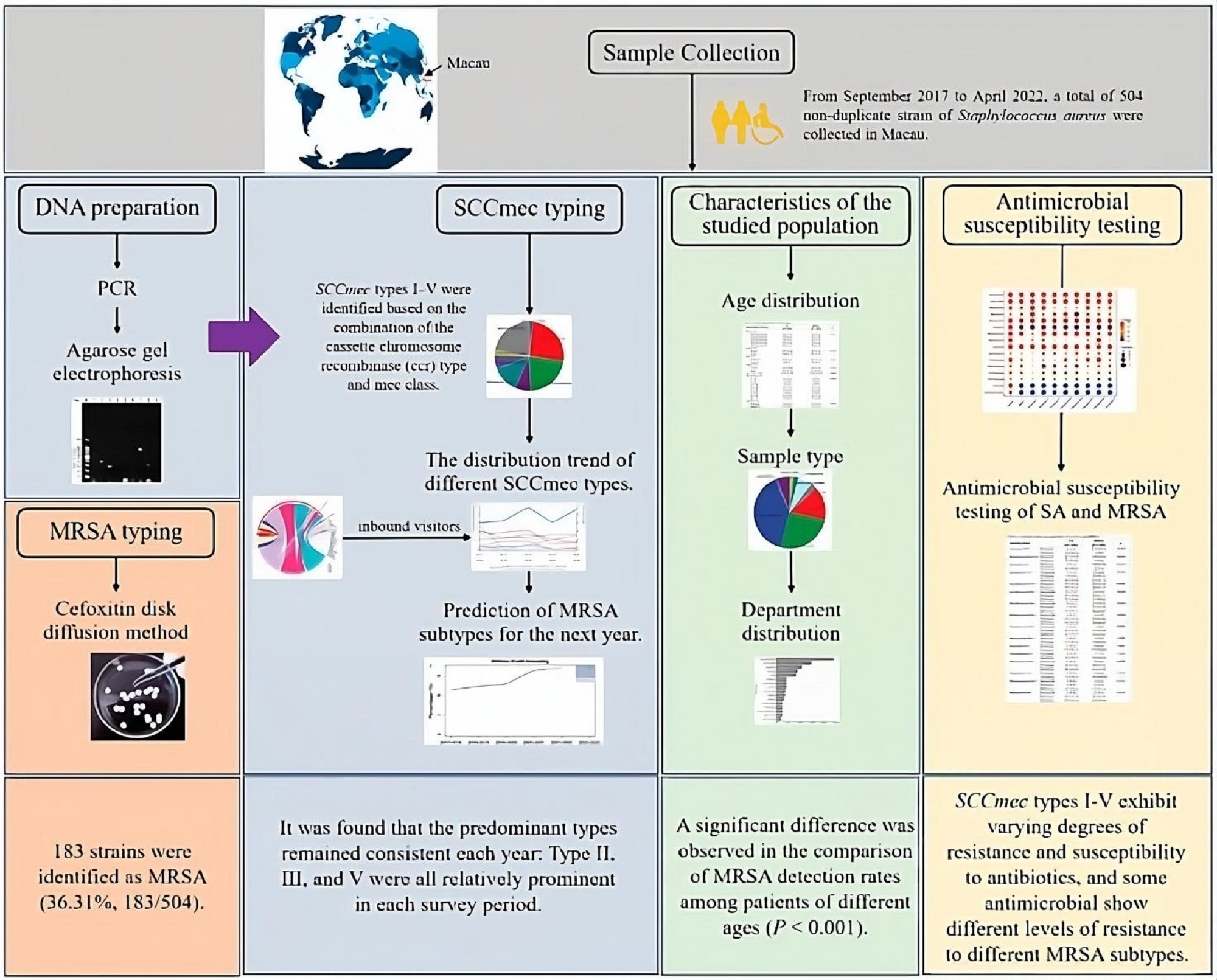 Trata-se de um estudo específico sobre Macau, com o objectivo de investigar a singularidade da MRSA no ambiente clínico de Macau, e avaliar as características locais da MRSA, tanto do ponto de vista macro como micro. A resistência única aos medicamentos e os padrões epidemiológicos da MRSA foram analisados através da utilização de várias ferramentas genéticas e microbiológicas, combinadas com algoritmos de inteligência artificial. Os resultados do estudo proporcionam medidas preventivas e uma base científica para a abordagem das estratégias de transmissão e tratamento da MRSA.