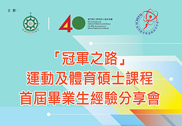 ![]() 澳理工舉辦“冠軍之路—運動及體育碩士課程首屆畢業生經驗分享會”誠邀參與為讓學生及市民了解更多有關運動及體育碩士學位課程的學習和生活情況,澳門理工學院健康科學及體育高等學校將於11月6日舉辦“澳門理工學院四十週年校慶活動:‘冠軍之路’—運動及體育碩士課程首屆畢業生經驗分享會”, 歡迎各界人士參與。 |