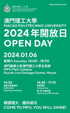 ![]() 澳理大2024年開放日1月6日舉行歡迎參與澳門理工大學將於1月6日(星期六)舉行2024年開放日,設有學位課程講解會、升學諮詢、專題展覽、校園導覽、分享、工作坊、專業體驗活動、畢業生分享會等,讓社會各界了解澳理大的課程設置和教研成果,體驗大學生生活,感受多元校園文化,開放日活動精彩,歡迎應屆中學畢業生、社會菁英、家長及有興趣人士蒞臨參與。 |