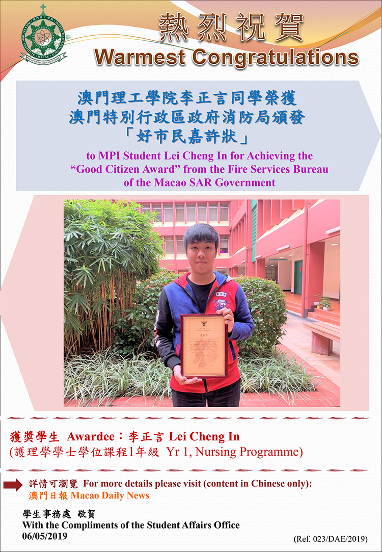 澳門理工學院李正言同學榮獲澳門特別行政區政府消防局頒發「好市民嘉許狀」