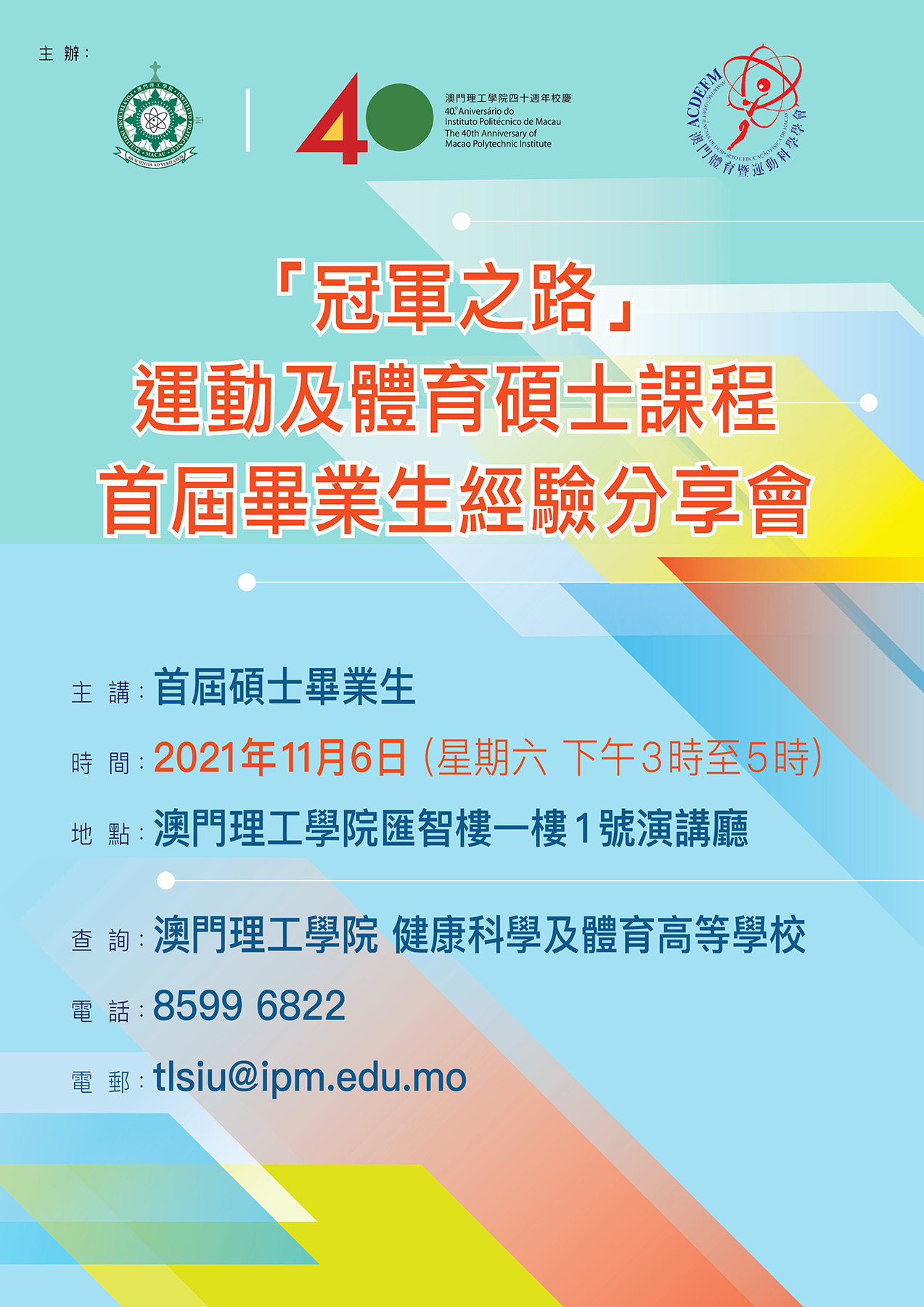 “冠軍之路—運動及體育碩士課程首屆畢業生經驗分享會” 將於11月6日下午三時至五時在澳門理工學院匯智樓一樓1號演講廳舉行,語言為廣東話,歡迎有興趣人士參與。為配合澳門特區政府衛生局的防疫指引,參與活動之人士必須配戴口罩、接受體溫探測,並出示當天有效的個人【澳門健康碼】。
