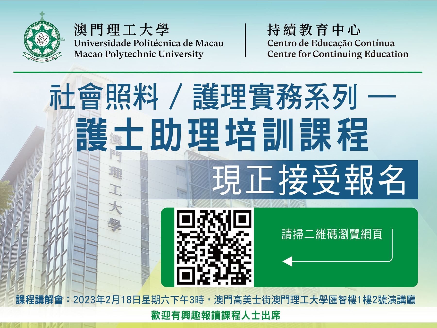 為配合特區政府社會文化司持續完善民生服務,提升居民生活素質施政方針,澳門醫療機構及院舍需要,培訓護士助理,提升照顧者的知識、技能和態度,以保障照顧服務素質,澳門理工大學持續教育中心開辦“護士助理培訓課程”,為有志投身醫療護理機構健康照顧工作的人士提供培訓。“護士助理培訓課程”由澳門理工大學健康科學及體育學院教學人員、臨床資深護士講授護理理論與實務,特區政府衛生局支持臨床實習。課程由即日起報名至2023年3月3日,並設有課程講解會。