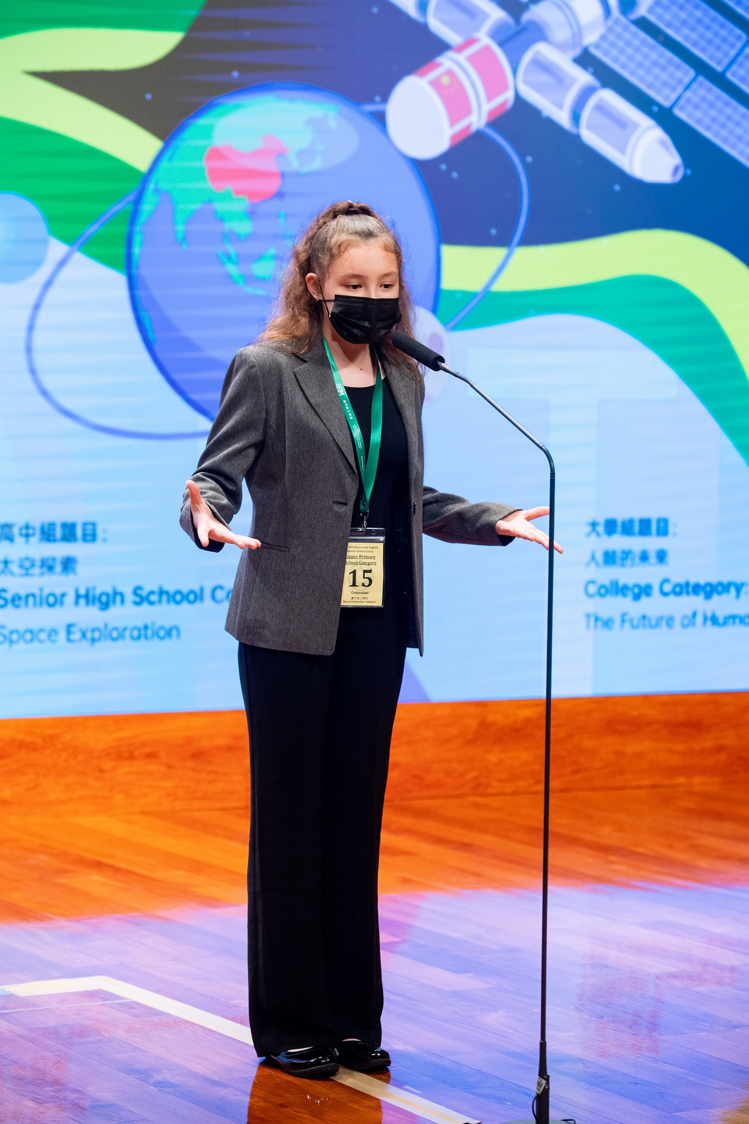 The overall theme of the 20th Macao-wide English Speech Contest was “Planet Earth”. Under this theme, the subtopics for the different categories were: “The Future of Human Beings” for the College Category, “Space Exploration” for the Senior High School Category, and “Caring for the Earth” for the Upper Primary School Category. The final round of the Contest included a total of 41 contestants, who were selected from among 136 semifinal contestants. This year, the semifinal took place by video judging rather than on-stage performance. The final round was live on stage in the Auditorium of MPI, and was also live-streamed. It was a joyous occasion, with the brilliant contestants displaying their public speaking talents and their deep insights on the topics. The distinguished panel of judges consisted of professors representing the institutions of higher education in Macao.