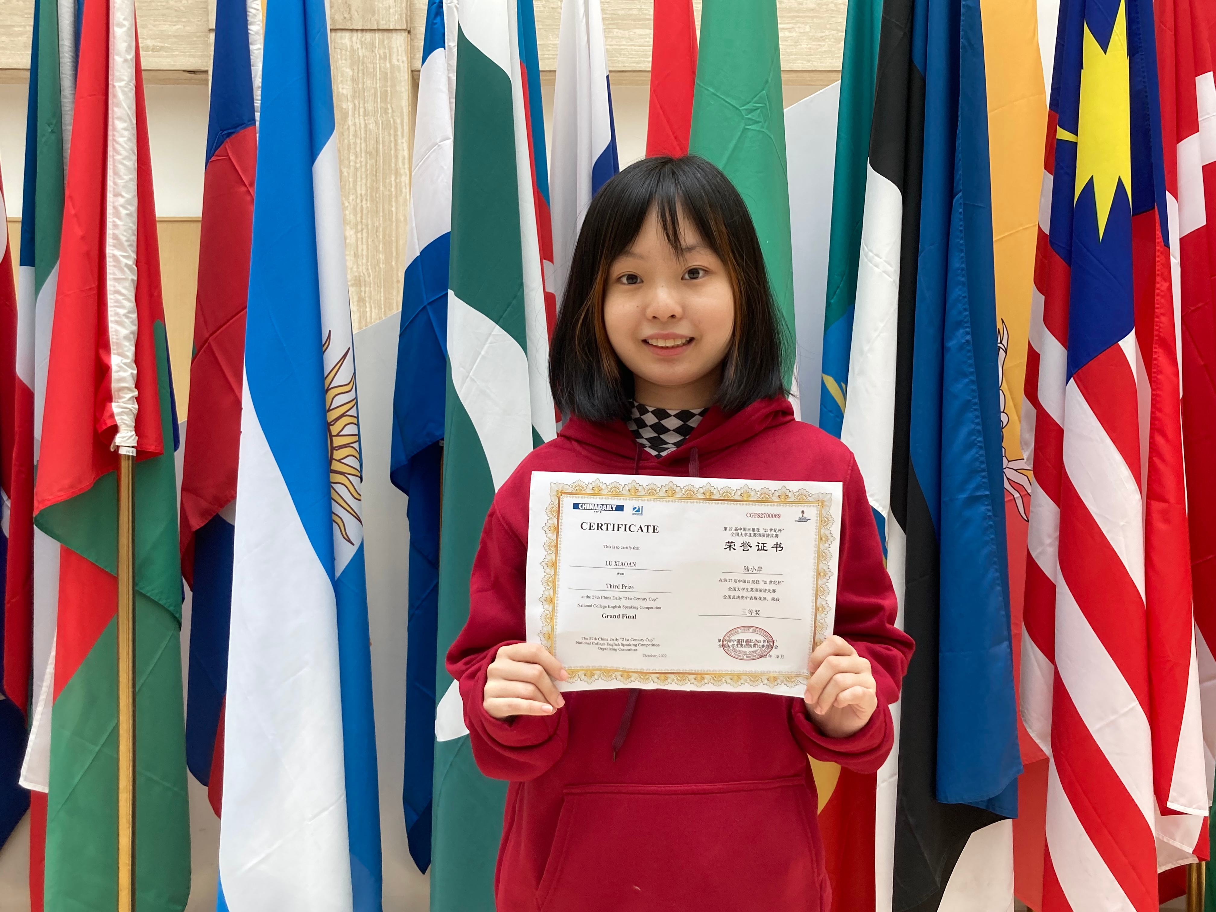 A third-year student in the Chinese-English Translation and Interpretation Bachelor's Degree Programme of the Faculty of Languages and Translation of Macao Polytechnic University, Lu Xiaoan, performed well and won the third prize in the final of the National University Student English Speaking Competition.