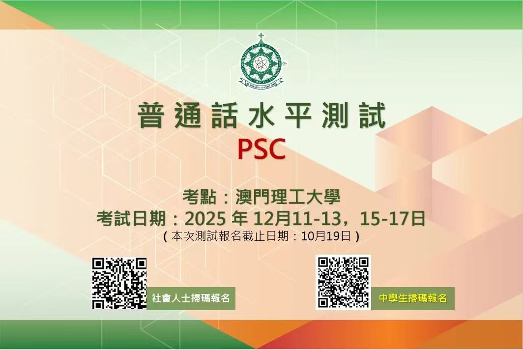 The Macao Polytechnic University (MPU) is now accepting registrations for the December 2025 Putonghua Proficiency Test (PSC), jointly organized with the State Language Commission (SLC). The test will be held 11-13 and 15-17 December. All members of the public are welcome to register. The registration deadline is 19 October.