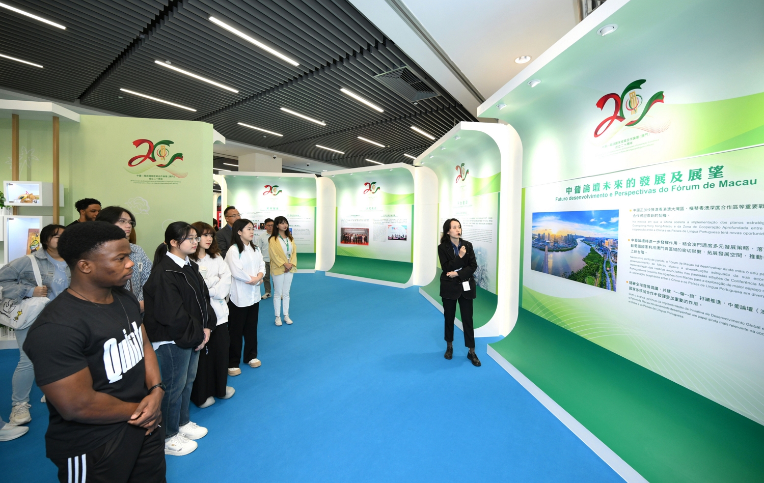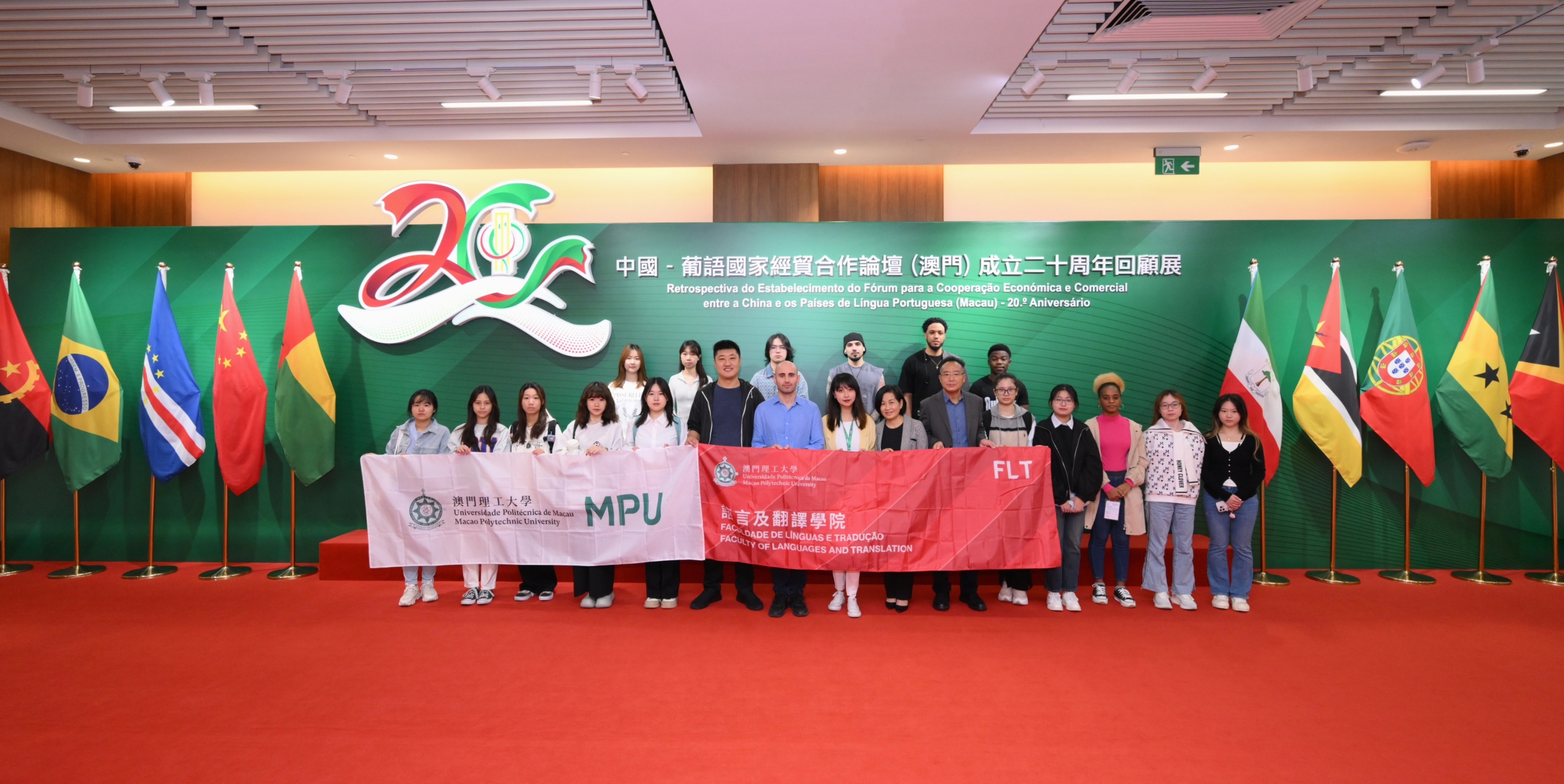 No âmbito da promoção do estabelecimento da Base de Formação de Quadros Qualificados Bilingues em Chinês e Português, e com a intenção de contribuir para que Macau desempenhe o papel de plataforma na promoção da cooperação e intercâmbio em diversas áreas entre a China e os Países de Língua Portuguesa, bem como permitir aos estudantes vivenciarem o papel de Macau como ponte e elo entre a China e os Países de Língua Portuguesa, os alunos dos cursos de Mestrado em Tradução e Interpretação Chinês-Português, Licenciatura em Tradução e Interpretação Chinês-Português/Português-Chinês, Licenciatura em Português e Licenciatura em Ensino da Língua Chinesa como Língua Estrangeira da Faculdade de Línguas e Tradução da Universidade Politécnica de Macau (UPM) deslocaram-se à exposição intitulada "Retrospectiva do Estabelecimento do Fórum para a Cooperação Económica e Comercial entre a China e os Países de Língua Portuguesa (Macau) - 20.º Aniversário" para realizar estágios voluntários e participar em actividades formativas. Os alunos dos cursos de Licenciatura e Mestrado em Tradução Chinês-Português da UPM participaram activamente nesta exposição retrospectiva, actuando como intérpretes bilingues para apresentar ao público o importante papel desempenhado por Macau nos últimos 20 anos na cooperação sino-lusófona.