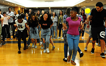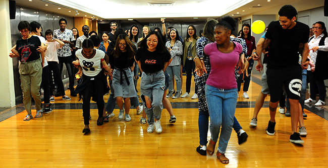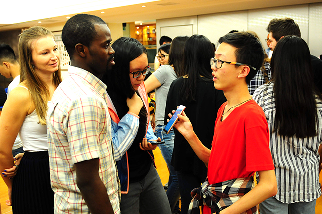 活動之一“中外學生結語伴”在理工致遠樓大堂舉行,吸引了近百名中外學生參加。舉行活動前的數周,各班班長在老師做好了充分籌備,建立微信群集思廣益,確定活動程式、活動專案及主持人。活動當日,中外同學按分組,在一年級國際漢語教育母語班學生的集體詩朗誦後,隨即開始了各項結語伴活動。現場氣氛歡樂和諧,這些趣味活動吸引了各組同學一次又一次相互挑戰,如中文接力葡語傳遞號碼、中文解說國際學生動作呈現、二人合作徒手運送氣球等,參與學生還三兩成對結成語伴一起交流,踴躍互動。