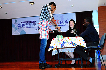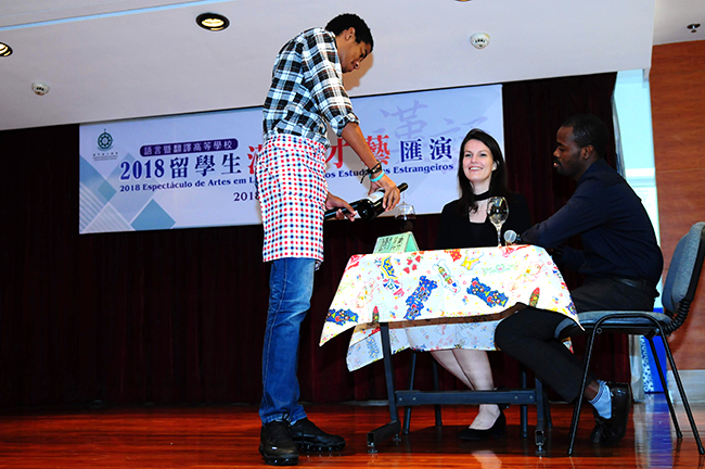 另外,“留學生漢語才藝匯演” 安排在匯智樓演講廳舉行,各年級的國際學生組織上臺獻藝,節目形式豐富,內容生動有趣,有小品、相聲、詩歌朗誦等。其中二年級的學生集體合作表演了舞臺劇“曹沖稱象”;一年級的學生在小品“吃飯”中串演曲藝、詩歌朗誦;三年級的學生則用中葡文朗誦了葡萄牙著名詩人賈梅士的長詩《葡國魂》片段,現場氣氛熱烈。值得提及的是,一年級的國際學生以僅學了不到半年的中文表演小品,並串唱中文歌曲、詩歌朗頌。活動凸顯了國際學生學習中文的積極態度,反映了理工提高國際學生中文水平的教學成效。