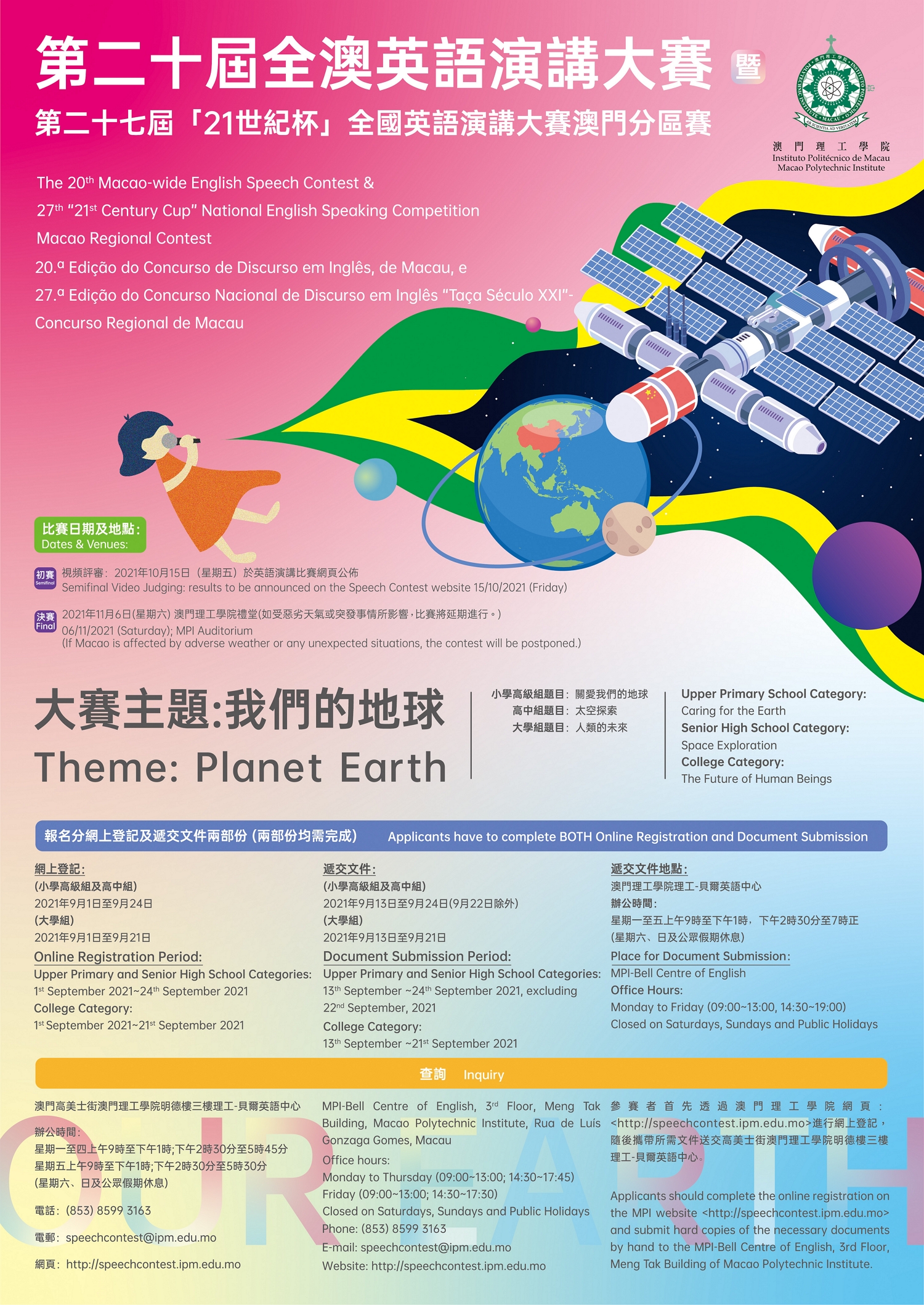 澳門理工學院主辦的『第二十屆全澳英語演講大賽暨第二十七屆「21世紀杯」全國英語演講大賽澳門分區賽』現正接受報名