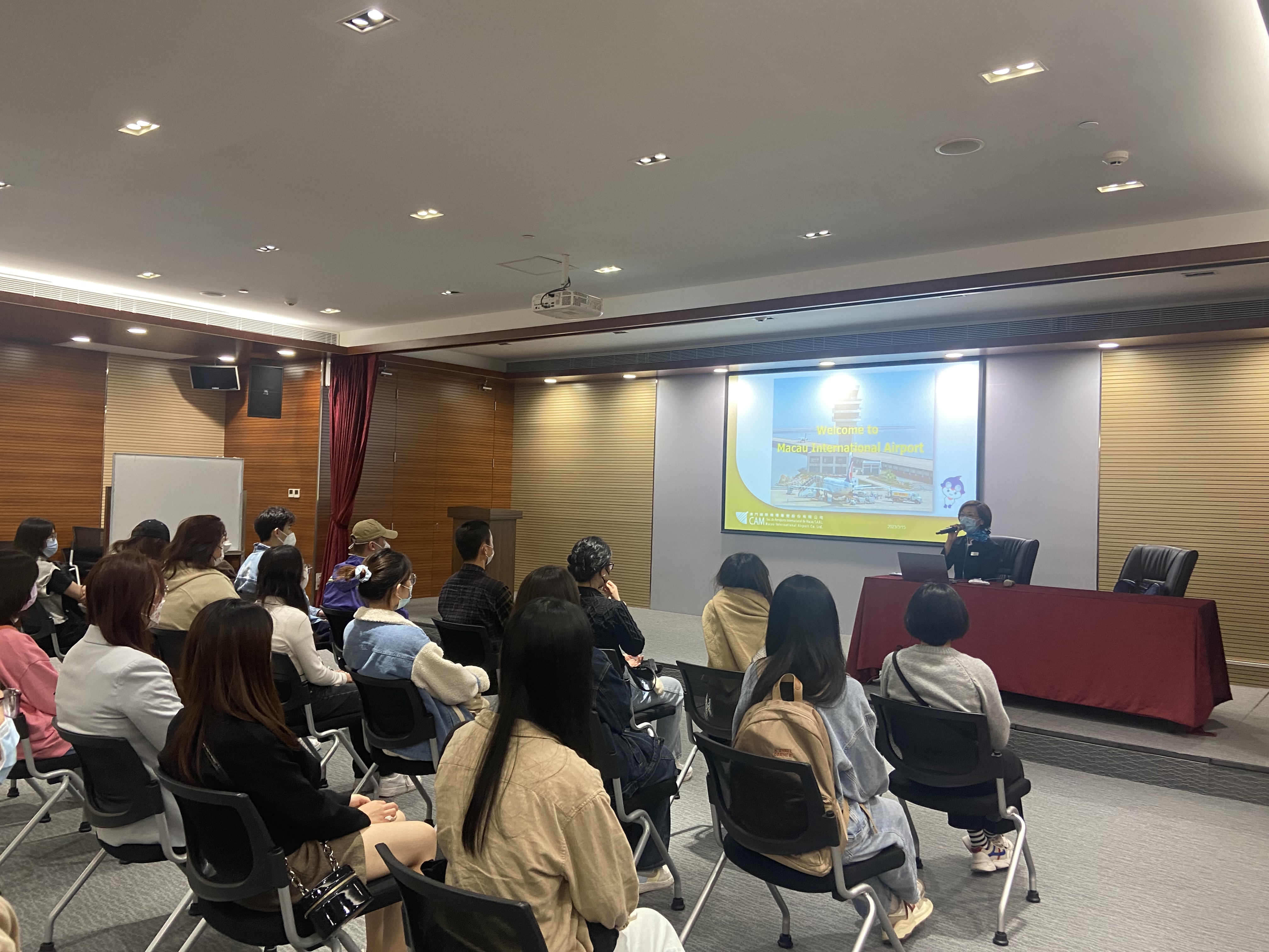 本次參觀全程由澳門國際機場專營股份有限公司機場營運部高級公關主任邢春蕊女士擔任講解。邢主任畢業於澳門理工大學中英翻譯課程,當她得知學弟學妹們前來參觀,特地在百忙之中抽出時間親自為他們上了一堂生動有趣的課。