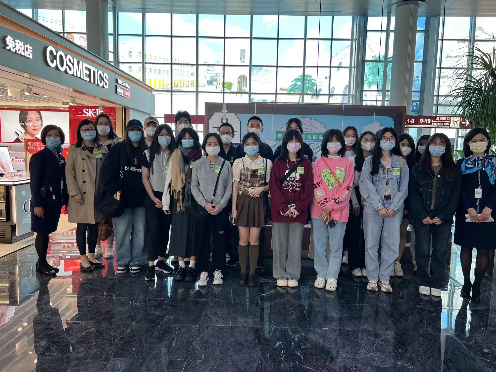 到達機場後,同學們首先聆聽了一場有關機場基本設施和航班運作常識的講座。由於國際航空業的通用語是英語,同學們在獲取航空知識的同時還學習了專門領域的詞彙。一些常用的詞彙,比如taxi, marshal 在航空用語中有不同的意思。隨後,在工作人員的引導下,同學們走進機場禁區,近距離觀察和瞭解了每個區域的功能和服務項目,體驗了機場內部的工作環境和接待外賓的抵離澳流程。整個參觀過程緊湊而有序,同學們更切身感受到了疫情過去後澳門經濟逐步恢復的喜人節奏。