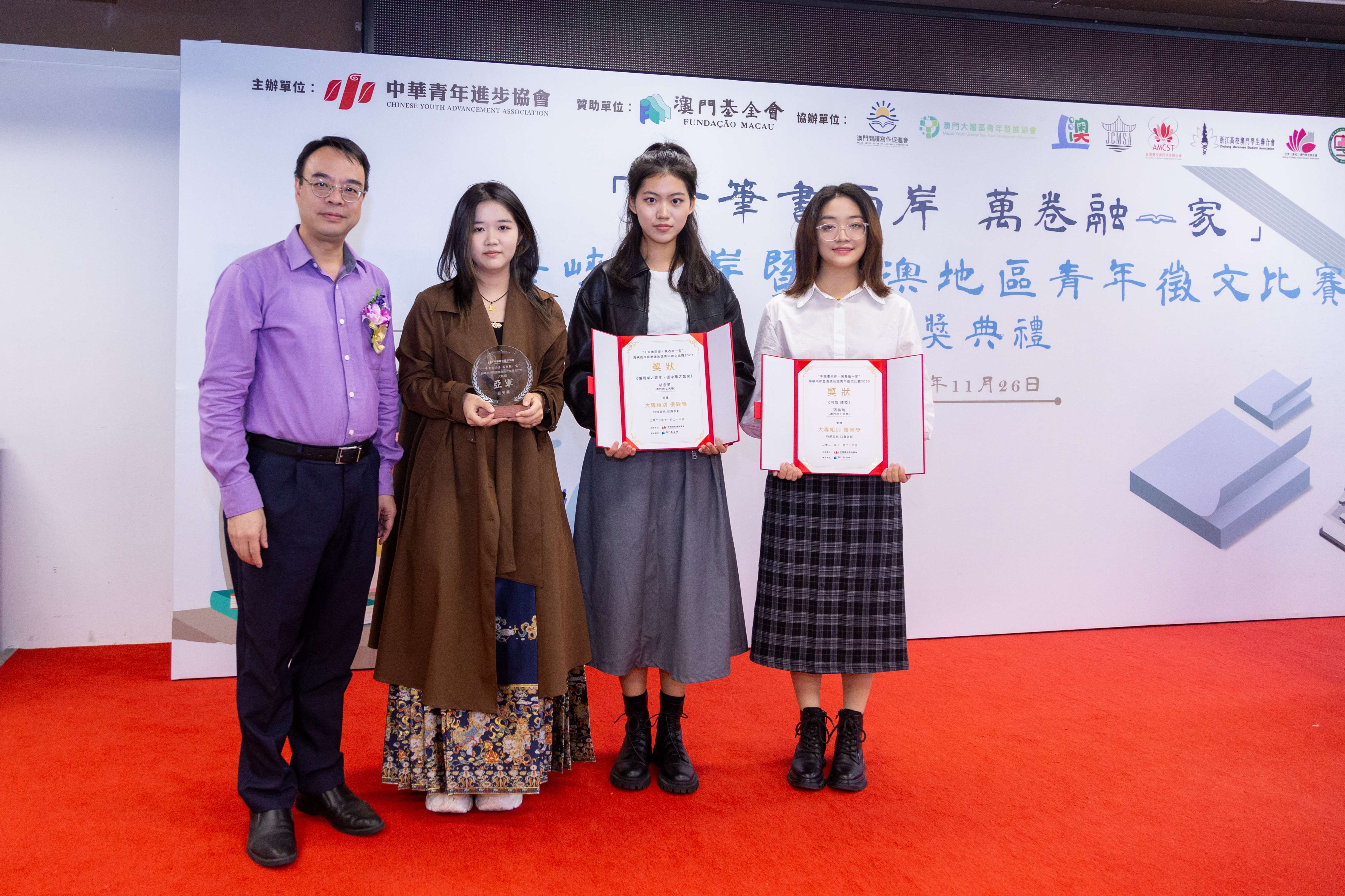 “千筆書兩岸 萬卷融一家 —— 海峽兩岸暨港澳地區青年徵文比賽”日前舉行頒獎典禮,澳門理工大學學生獲得大專組亞軍及優異獎,成績喜人。本次大賽由澳門中華青年進步協會主辦,旨在加強海峽兩岸暨港澳地區青年的互相了解,弘揚中華文化,認識中國國情,攜手共創美好未來。