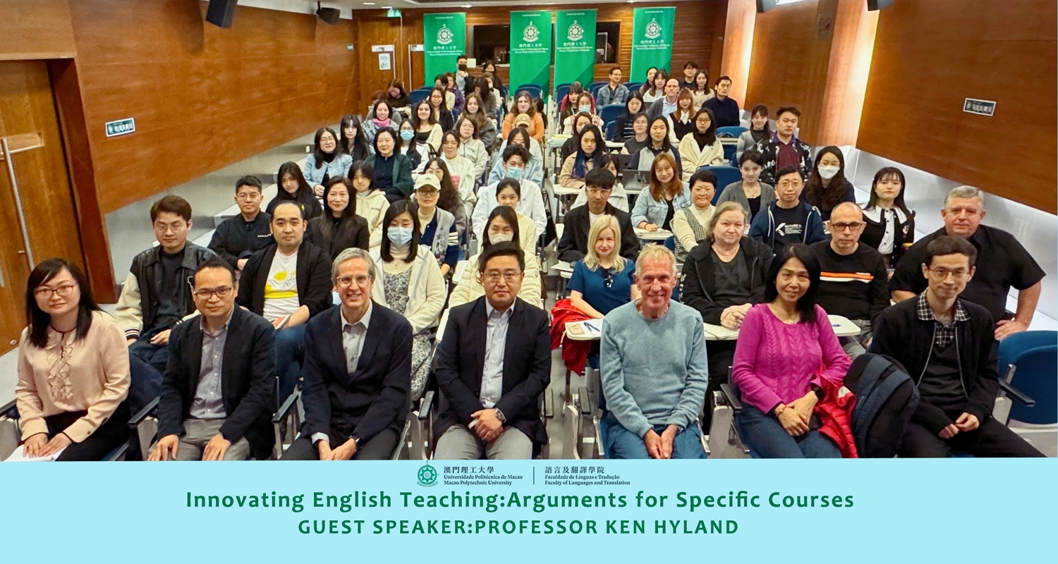 為推動澳門國際高等教育交流與合作,澳門理工大學語言及翻譯學院邀請世界頂尖應用語言學家Ken Hyland,以“創新英語教學:針對專門課程的論據”為題發表了精彩的學術演講,線上線下吸引來自澳門及大灣區眾多高校師生四百人參加,Hyland與出席師生親切交流、深入探討,反應熱烈。