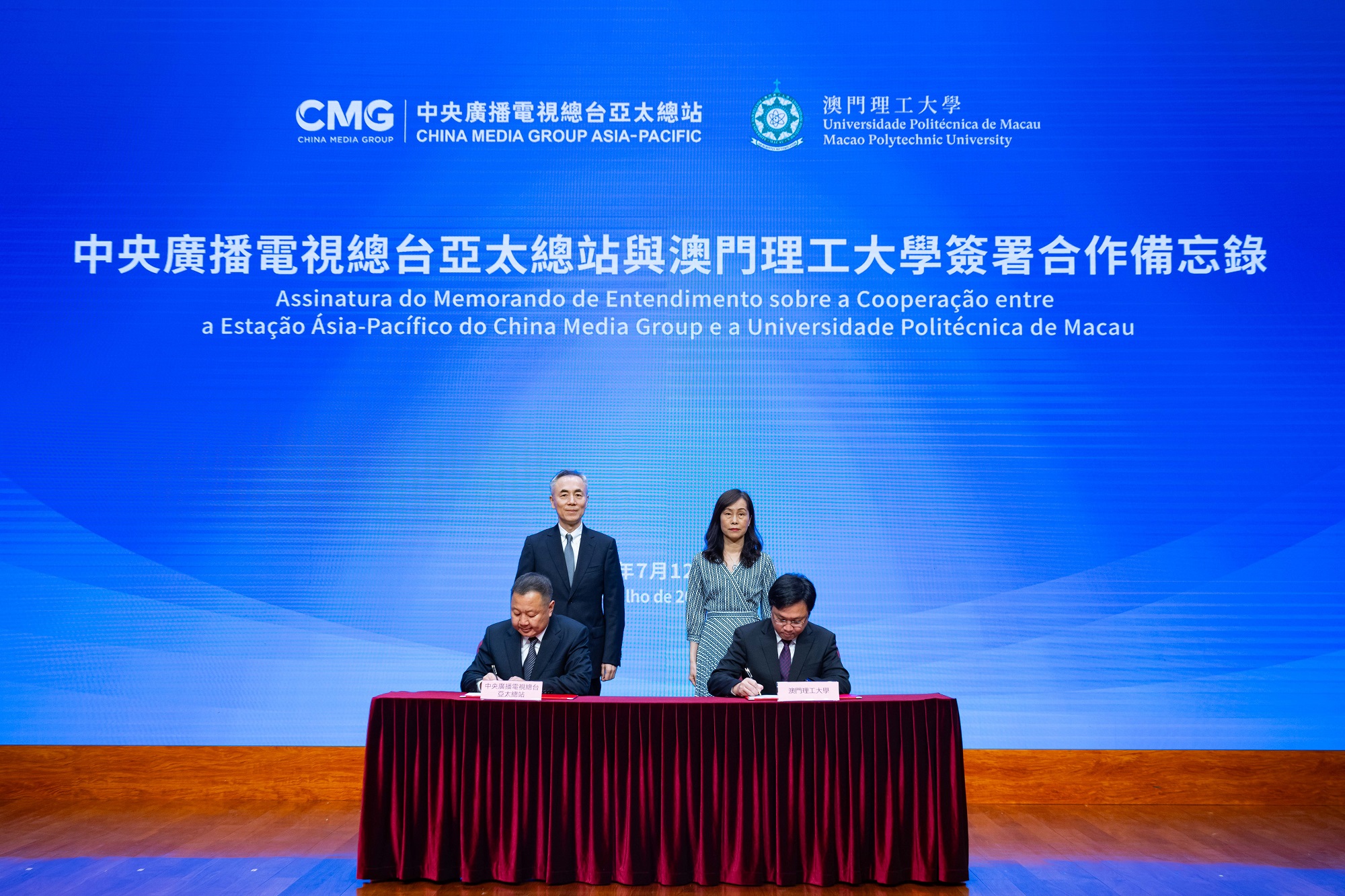 總台亞太總站站長曹毅和澳門理工大學校長嚴肇基代表雙方簽署《中央廣播電視總台亞太總站與澳門理工大學合作備忘錄》。雙方將以此為契機,推動總台在新聞報導、國際傳播、節目創作、科技創新、媒體融合等方面的媒體優勢與澳門理工大學在人才培養、國際智庫、機器翻譯及人工智能應用技術等學科優勢有機融合,共同致力於培養新型葡語國際傳播人才、推動前沿技術在視音訊領域的深度應用,助力澳門更好融入國家發展大局。