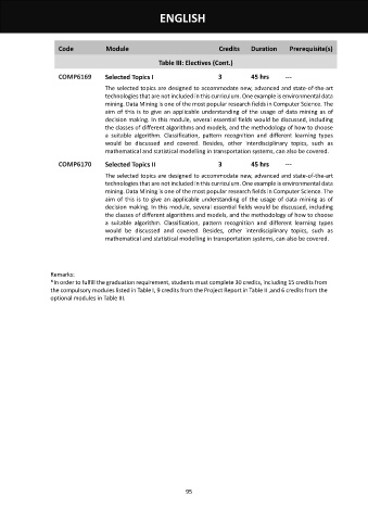 the compulsory modules listed in Table I, 9 credits from the Project Report in Table II ,and 6 credits from the