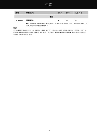 中文 編號 學科單元 學分 學時 先修科目 表四 TICP6298 項目報告 5 --- --- 確定、管理和開展筆/傳譯項目;熟悉、體驗和理解本專業內涵,強化專業技能,提 高實踐能力和團體協作精神。 備註: *完成課程所需的學分至少為 36 學分,其分配如下:表一的必修學科單元/科目佔 12 學分;表二的 已選專業範疇必修學科單元/科目佔 15 學分;表三的已選專業範疇選修學科單元/科目佔 4 學分; 表四的項目報告佔 5 學分。 37
