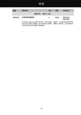 中文 編號 學科單元 學分 學時 先修科目 選修科目 - 組別 C(續) SOCI4122 社會科學專題研討 3 45 hrs PSYC1101, SOCI1101 本科目旨在從多元的社會科學出發,採用心理學、社會學、文化學等角度帶領同學 探討不同的重要社會課題。當代新興的社會問題、同學的共同興趣、以及授課老師 的學術專業是本科目選題的考慮因素。 147