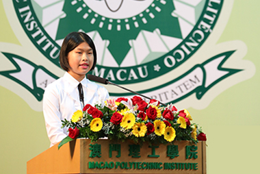 A aluna Chio Hoi Lam discursou em representação dos novos alunos do IPM. Afirmou que a participação na Cerimónia de Abertura do Ano Académico foi muito relevante para todos os novos alunos, uma vez que isso significa o acesso ao comboio de sonho para abrir uma nova página nas suas vidas. A aluna partilhou ainda a sua experiência sobre a decisão de se candidatar ao IPM, esperando vir a ser uma especialista em enfermagem e dedicar-se a esta área, de forma a responder aos apoios e estímulos da família, dos professores e dos amigos. Desejou que ela e os colegas possam ter sucesso no futuro, após a graduação, a fim de se dedicarem à sociedade e construírem um melhor Macau.
