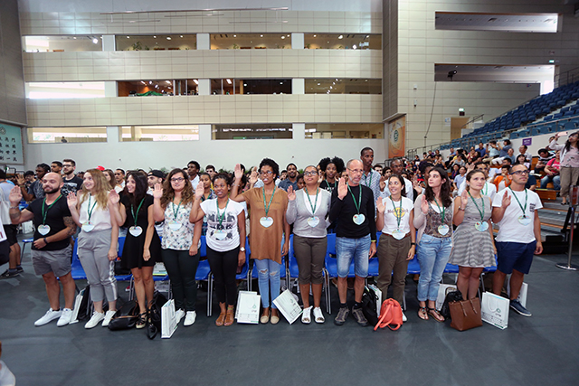 Os novos alunos prestando juramento de integrarem bem no IPM |
