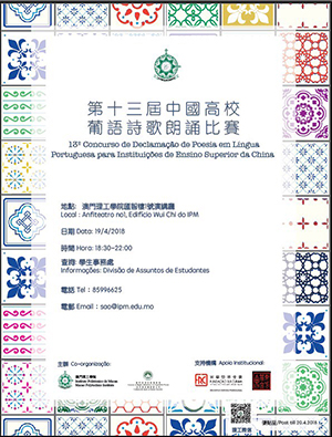 Vai realizar-se no dia 19 de Abril, pelas 18:30, no Edifício Wui Chi, Anfiteatro no.1, do Instituto Politécnico de Macau, o 13º Concurso de Declamação de Poesia em Português para Instituições de Ensino Superior da China. Esta iniciativa, co-organizada, pelo Instituto Politécnico de Macau e o Gabinete de Apoio ao Ensino Superior da RAEM, tem como objectivo não só estimular o prazer da arte da declamação e despertar talentos nessa arte, como também aprofundar o interesse pelas literaturas e culturas de língua portuguesa, incentivar o hábito da leitura e promover o convívio e intercâmbio cultural entre estudantes de Língua Portuguesa na República Popular da China.