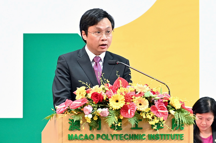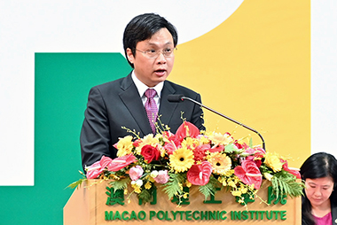 A Cerimónia foi presidida pelo Presidente do IPM, Prof. Im Sio Kei. No seu discurso, além de dar as boas-vindas aos novos alunos do Instituto, o Presidente do IPM confirmou que a instituição irá continuar a cumprir o seu princípio pedagógico para o ensino superior “Amar a Pátria e Macau, enraizar-se em Macau, servir melhor a sociedade e voltar-se para todo o Mundo”, formando quadros qualificados com competências profissionais e espírito inovador. O modelo de formação e a qualidade pedagógica do IPM são já reconhecidos a nível internacional, tendo a instituição recebido vários prémios internacionais relativos à qualidade de ensino; os actuais alunos e graduados também obtiveram excelentes resultados nos concursos nas áreas do desporto e da inovação científica e tecnológica. Na verdade, no IPM, há muitas excelentes tradições, histórias gloriosas, êxitos extraordinários e honras fantásticas, que, enquanto heranças, merecem ser reconhecidas e reavivadas por todos os alunos. O Presidente destacou ainda no seu discurso que o Instituto dá muita importância ao pensamento inovador e ao desenvolvimento integral dos alunos e disse ainda esperar que os alunos elevem a sua consciência sobre a importância do optimismo, da resiliência e da união, que alarguem horizontes, prestem maior atenção às questões actuais da sociedade e adquiram mais conhecimentos, de modo a alcançarem uma vida plena e rica.