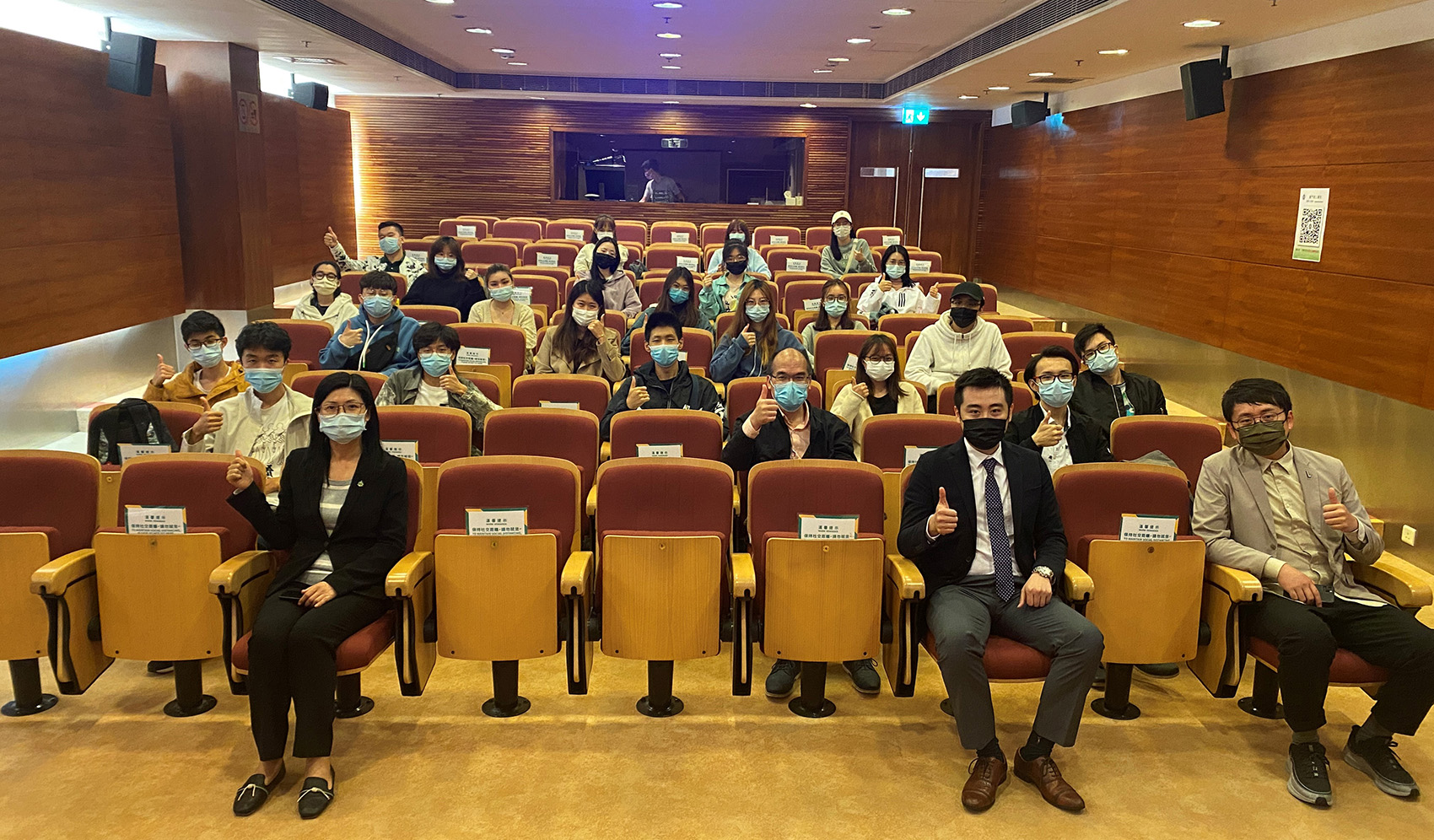 Foto em grupo entre os oradores da Palestra "Posição do Empreendedorismo dos Jovens: Made in Macau" e os alunos e professores do IPM