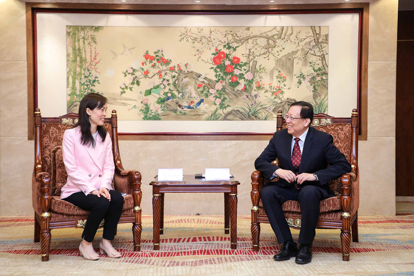Antes do início da Cerimónia de Assinatura, o Reitor Hao Ping teve um encontro com a delegação liderada pela Dra. Ao Ieong U e Professor Im Sio Kei, em que ambas as partes trocaram opiniões sobre os assuntos relacionados com a cooperação pedagógica e científica entre a Universidade de Pequim e a Grande Baía de Guangdong-Hong Kong-Macau. O Reitor Hao referiu que a Grande Baía tem as funções de suporte e orientação para o desenvolvimento económico da China e para a sua abertura ao mundo, e a Universidade de Pequim vai aprofundar o seu intercâmbio e cooperação com o ensino superior de Macau de forma a elevar o nível da cooperação entre o Interior da China e Macau na formação de talentos. O Reitor da Universidade de Pequim acrescentou que vai continuar a concretizar o espírito de trabalho do Governo Central para com Macau, realizando uma cooperação sincera com o IPM no sentido de, em conjunto, formarem talentos de nível internacional na área de enfermagem, respondendo assim às necessidades estratégicas do País e assumindo as responsabilidades sociais da Universidade de Pequim. Segundo a Dra. Ao Ieong U, Secretária para os Assuntos Sociais e Cultura, o Governo da RAEM tem vindo a aperfeiçoar o sistema de saúde de Macau nos últimos anos, reforçando também a formação de talentos em enfermagem, de forma a responder às necessidades para os vários serviços de saúde e também no sentido duma elevação constante do nível de saúde de Macau. A Universidade de Pequim é uma das melhores instituições de ensino superior da China, por isso, acredita que a cooperação entre a Universidade de Pequim e o IPM possa elevar o nível de ensino e investigação de Macau e da Grande Baía na área de enfermagem.