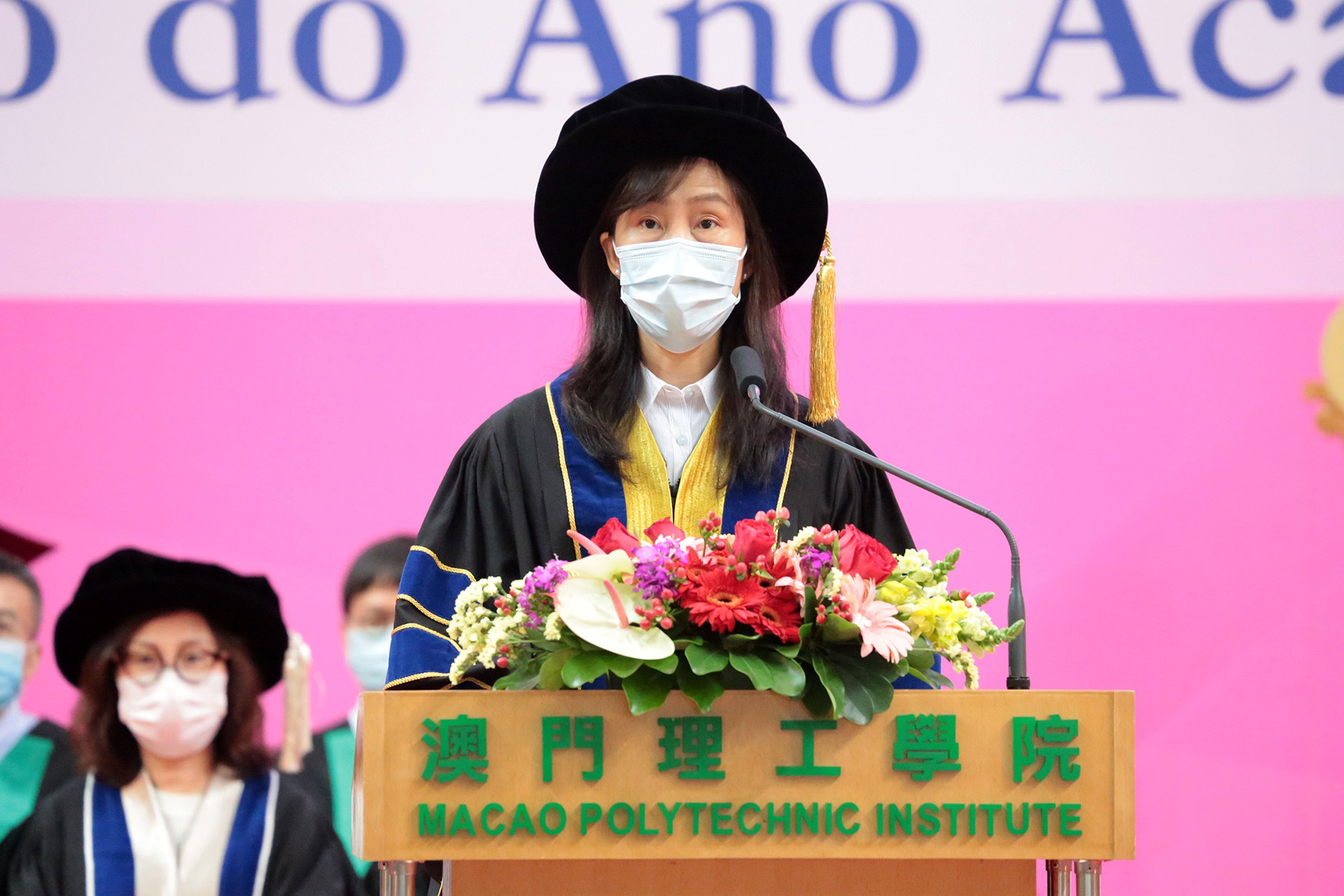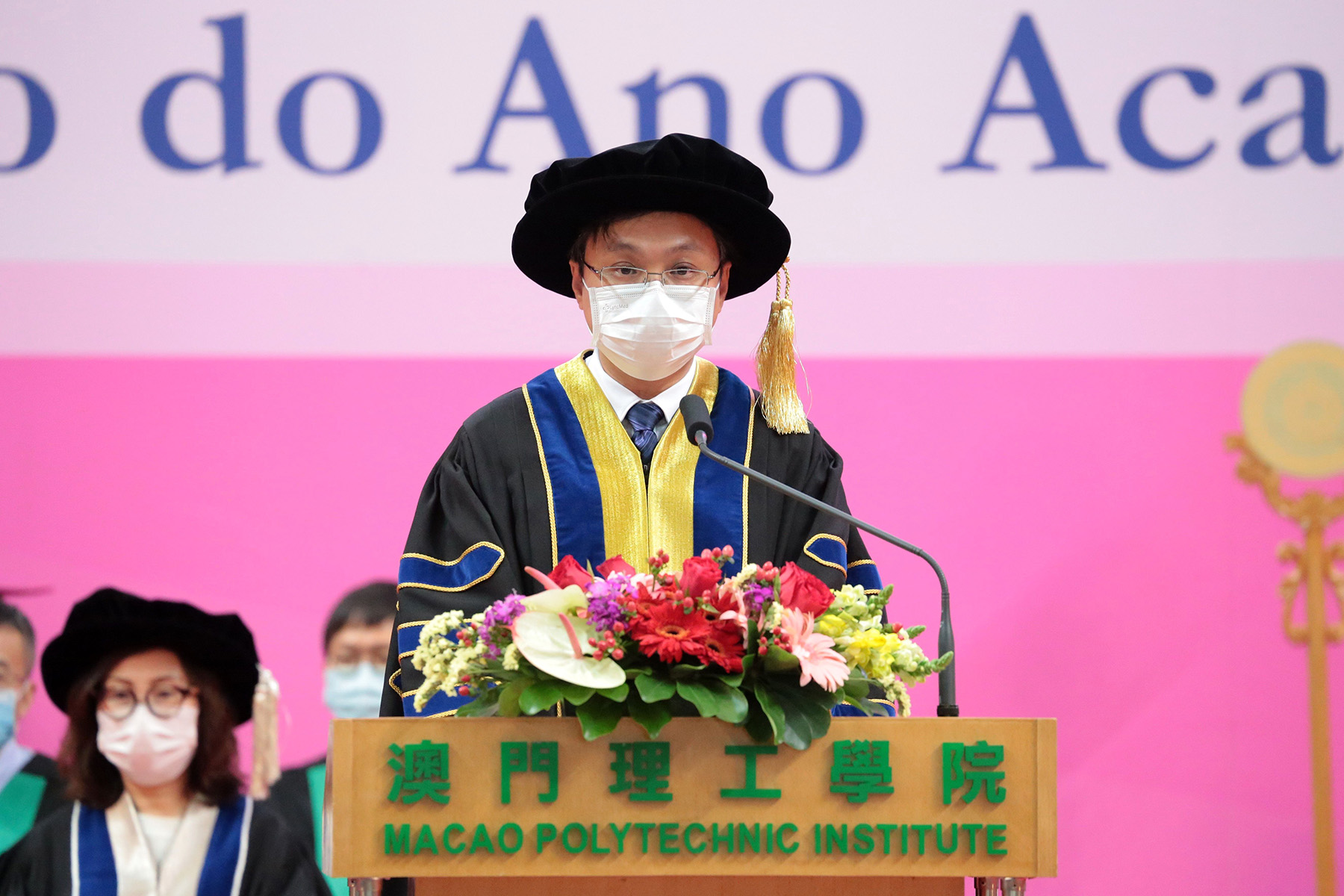 No seu discurso, o Presidente do Instituto, Im Sio Kei, referiu que o IPM acolheu os graduados da primeira edição dos cursos de pós-graduação do IPM, o que constitui uma marca importante do desenvolvimento do IPM, um novo patamar. Por conseguinte, este é mais um marco importante na história do IPM. Com o forte apoio do Governo da RAEM, foram já iniciadas as obras do novo edifício do IPM, que tem como objectivo criar melhores condições para o desenvolvimento de actividades futuras; no que diz respeito ao desenvolvimento sustentável, no ranking das Universidades Mundiais mais influentes do Times Higher Education do Reino Unido, o IPM situa-se entre os 301 e 400 lugares, significando que o IPM atingiu um elevado nível internacional; o IPM é a primeira e a única instituição de ensino superior de Macau a ter recebido o “National Teaching Achievement Award” do Ministério da Educação da China; o IPM criou também o primeiro Centro de Investigação de Engenharia do Ministério da Educação em Hong Kong e Macau; o IPM liderou a criação da “Aliança para o Ensino da Língua Portuguesa na Grande Baía”, de modo a reforçar o planeamento da cooperação na formação de talentos linguísticos entre Guangdong, Hong Kong e Macau, ajudando Macau a consolidar o papel da Base de Formação de Quadros de Língua Portuguesa e a desenvolver as funções de plataforma entre a China e os Países de Língua Portuguesa. Im Sio Kei desejou que os alunos graduados se mantenham firmes e seguros nos três princípios e convicções seguintes: primeiro, Estar atento à Pátria e ter o espírito de “amor à Pátria e a Macau”; segundo, Olhar para o mundo e olhar para longe; terceiro, Ter coragem para lutar e assumir a vossa missão. Afirmou esperar que eles possam agarrar as oportunidades desta nova era, integrando-se no desenvolvimento da Grande Baía, e que tenham a coragem de assumir o espírito de vanguarda da nova era, contribuindo para o desenvolvimento nacional e social.