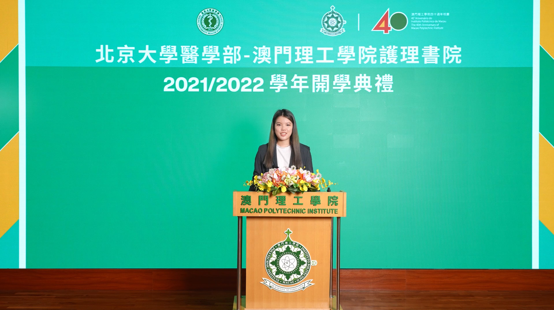 No discurso da representante dos novos alunos, Mak Chou Wai agradeceu a cooperação entre as duas instituições, e referiu que, por esta oportunidade, teve honra de ser um membro do primeiro grupo dos alunos da Academia de Enfermagem e de testemunhar este momento histórico. Afirmou ainda que irá aproveitar bem esta oportunidade preciosa de intercâmbio e estágio no Centro de Ciências de Saúde da Universidade de Pequim, e que, no novo ano académico, irá dedicar-se ao estudo e preparar-se bem para iniciar um novo capítulo maravilhoso da sua vida, construindo uma “Juventude dos Sonhos” na Academia de Enfermagem do Centro de Ciências da Saúde da Universidade de Pequim e do Instituto Politécnico de Macau.